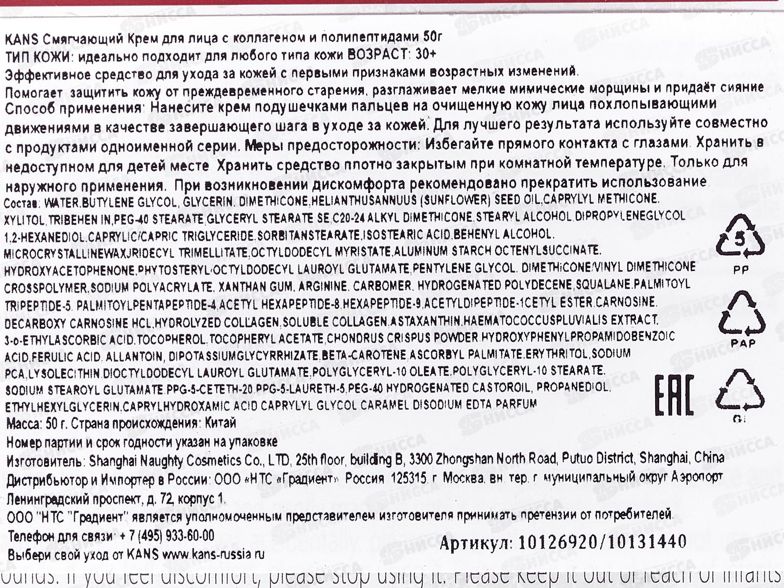 KANS Смягчающий крем для лица с коллагеном и полипептидами 50г