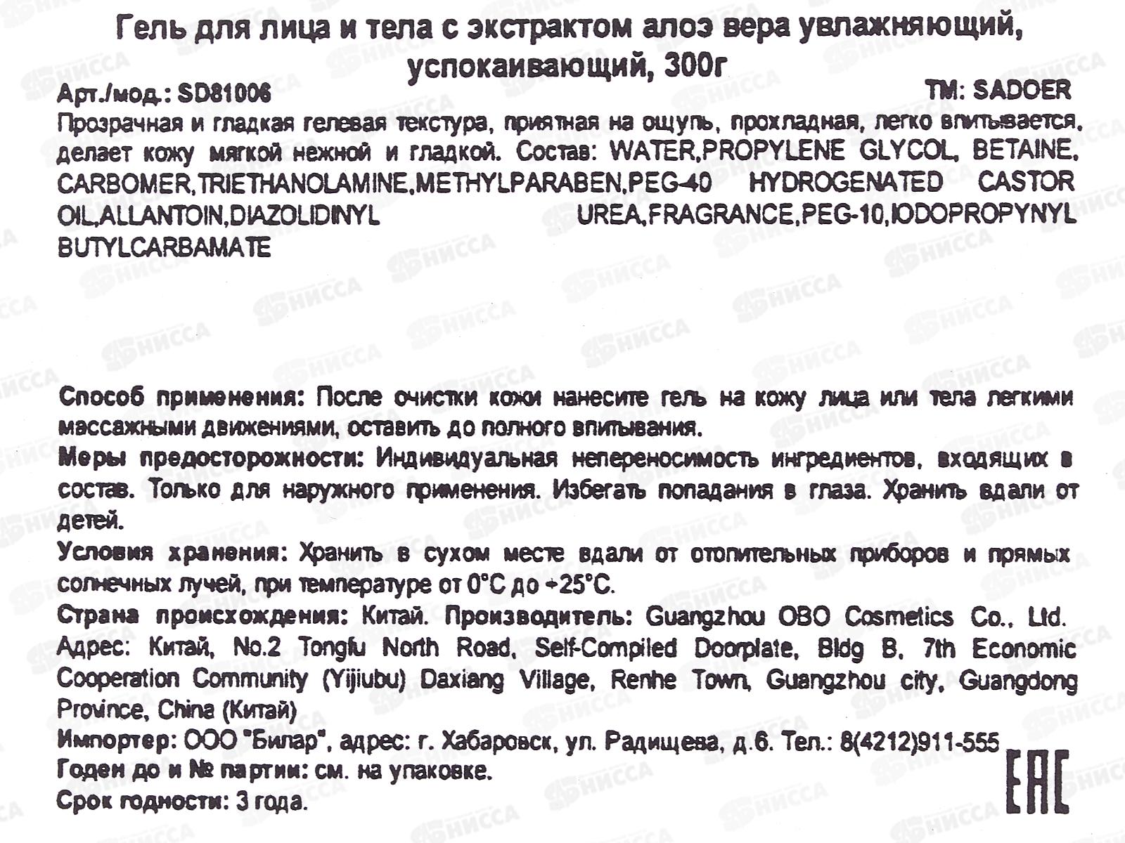 OBO Sadoer Гель для лица и тела 300г успок увлаж Алоэ вера *48