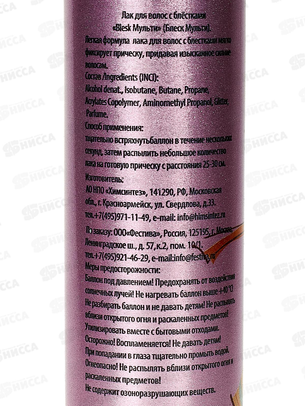 Состав: денатурированный спирт, изобутан, бутан, пропан, сополимер акрилатов, аминометилпропанол, блестки, парфюмерная композиция.