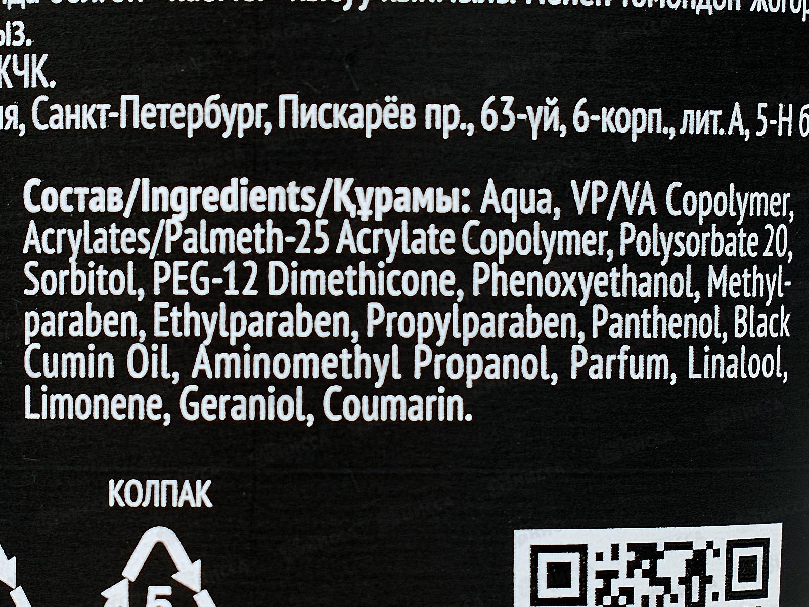 Состав: вода, сополимер винилацетата и акрилата, сополимер акрилатов/пальмет-25 акрилата, полисорбат 20, сорбитол, диметикон ПЭГ-12, феноксиэтанол, метилпарабен, этилпарабен, пропилпарабен, пантенол, масло чёрного тмина, аминометилпропанол, отдушка, линалоол, лимонен, гераниол, кумарин.