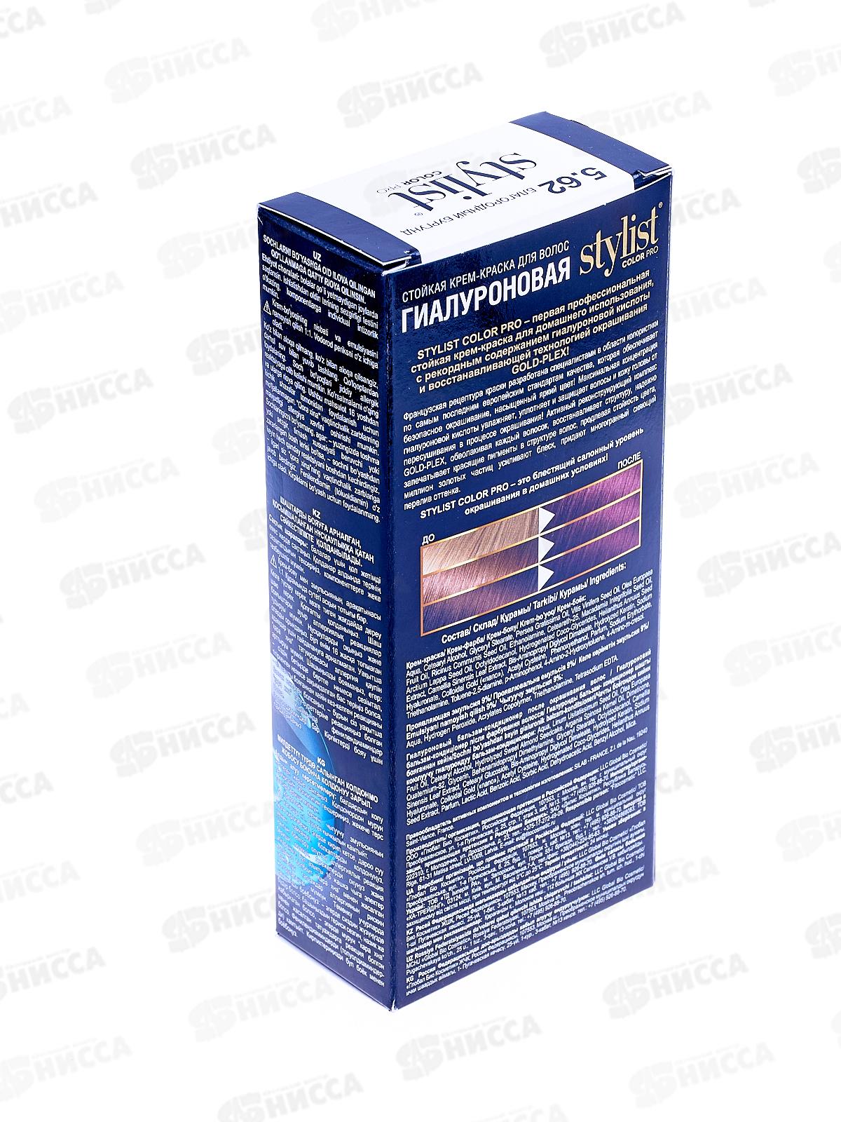 Краска Stylist Color Pro, тон 5.62 Благородный бургунд - первая профессиональная стойкая крем-краска для домашнего использования, с рекордным содержанием гиалуроновой кислоты и восстанавливающей технологией окрашивания GOLD-PLEX! Рецептура краски разработана во Франции специалистами в области колористики по самым последним европейским стандартам качества, которая обеспечивает безопасное окрашивание, насыщенный яркий цвет. Максимальная концентрация гиалуроновой кислоты увлажняет, уплотняет и защищает волосы и кожу головы от пересушивания в процессе окрашивания. Активный реконструирующий комплекс GOLD-PLEX, обволакивая каждый волосок, восстанавливает структуру, надежно запечатывает красящие пигменты в структуре волос, продлевая стойкость цвета, миллион золотых частиц усиливают блеск, придают многогранный сияющий перелив оттенка. Stylist Color Pro отлично подойдет женщинам как с начальной так и с глубокой сединой; если ваши волосы нуждаются в активном увлажнении и восстановлении; если вы хотите освежить или сменить свой образ без вреда для волос. После использования Stylist Color Pro волосы выглядят великолепно: приобретают яркий, стойкий, объемный цвет, становятся более плотными, густыми, эластичными и упругими. Stylist Color Pro — это блестящий салонный уровень окрашивания в домашних условиях!
