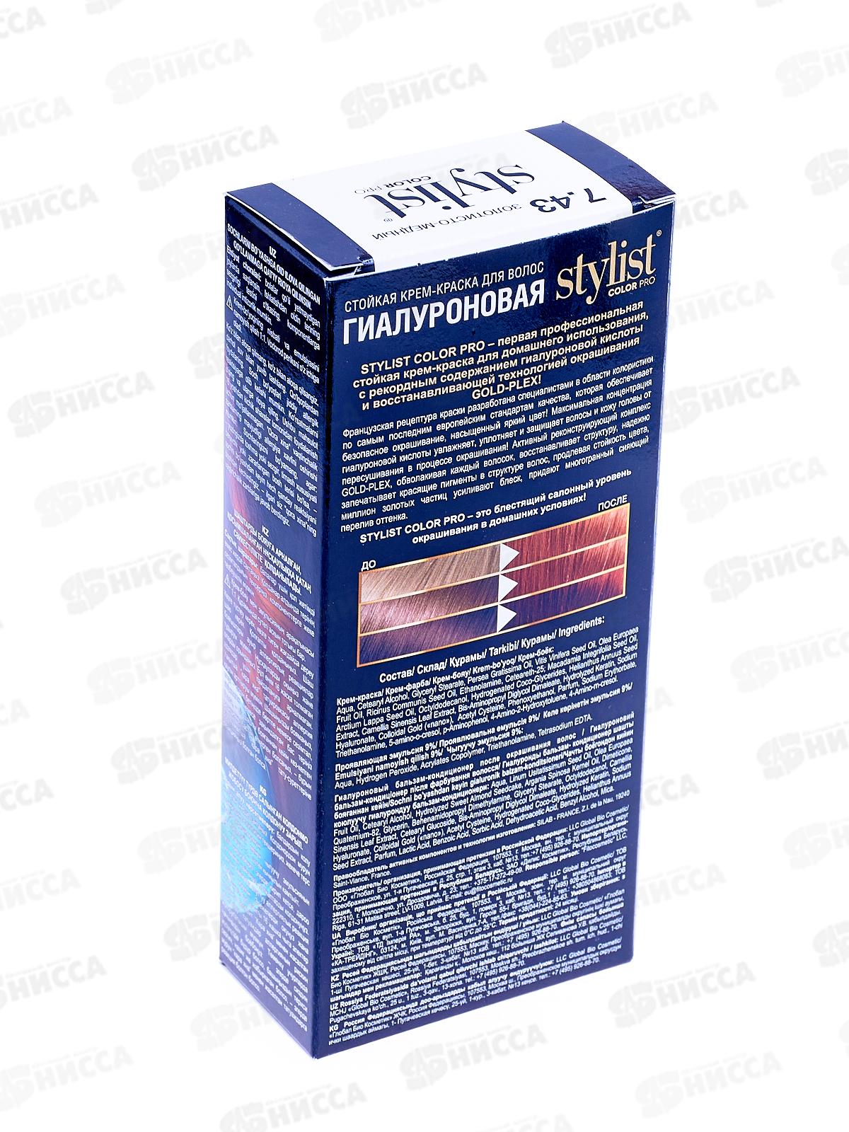 Краска Stylist Color Pro, тон 7.43 Золотисто-медный - первая профессиональная стойкая крем-краска для домашнего использования, с рекордным содержанием гиалуроновой кислоты и восстанавливающей технологией окрашивания GOLD-PLEX! Рецептура краски разработана во Франции специалистами в области колористики по самым последним европейским стандартам качества, которая обеспечивает безопасное окрашивание, насыщенный яркий цвет. Максимальная концентрация гиалуроновой кислоты увлажняет, уплотняет и защищает волосы и кожу головы от пересушивания в процессе окрашивания. Активный реконструирующий комплекс GOLD-PLEX, обволакивая каждый волосок, восстанавливает структуру, надежно запечатывает красящие пигменты в структуре волос, продлевая стойкость цвета, миллион золотых частиц усиливают блеск, придают многогранный сияющий перелив оттенка. Stylist Color Pro отлично подойдет женщинам как с начальной так и с глубокой сединой; если ваши волосы нуждаются в активном увлажнении и восстановлении; если вы хотите освежить или сменить свой образ без вреда для волос. После использования Stylist Color Pro волосы выглядят великолепно: приобретают яркий, стойкий, объемный цвет, становятся более плотными, густыми, эластичными и упругими. Stylist Color Pro — это блестящий салонный уровень окрашивания в домашних условиях!
