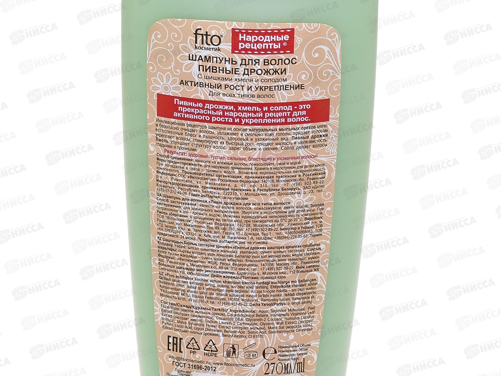Народные Рецепты Шампунь для волос "Пивные дрожжи" 270мл *16