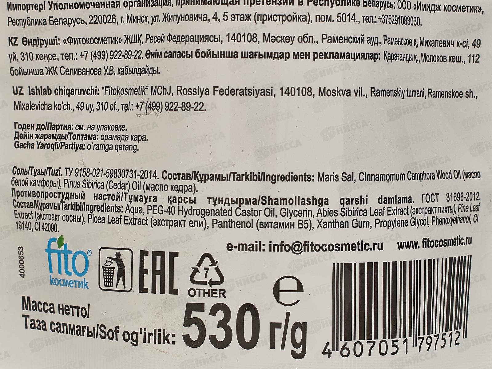Состав соли: морская соль, Cinnamomum Сamphora Wood Oil (масло белой камфоры), Pinus Sibirica (Cedar) Oil (масло кедра). Состав аротивопростудного настоя: вода, PEG-40 Hydrogenated Castor Oil, Glycerin, Abies Sibirica Leaf Extract (экстракт пихты), Pine Leaf Extract (экстракт сосны), Picea Leaf Extract (экстракт ели), Panthenol (витамин В5), Xanthan Gum, Propylene Glycol, Methylchloroisothiazolinone, Methylisothiazolinone, CI 19140, CI 42090.