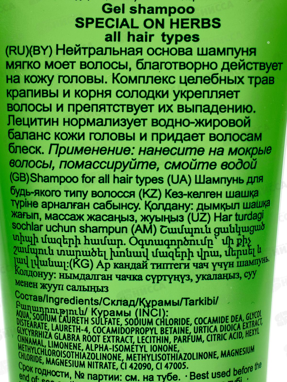 Состав: вода, лауретсульфат натрия, хлорид натрия, кокамид ДЭА, дистеарат гликоля, лаурет-4, кокамидопропилбетаин, экстракт крапивы двудомной, экстракт корня солодки голой, лецитин, отдушка, лимонная кислота, гексилциннамаль, лимонен, бутилфенилметилпропиональ, альфа-изометилионон, метилхлоризотиазолинон, метилизотиазолинон, хлорид магния, нитрат магния, СI 42090, CI 47005.
