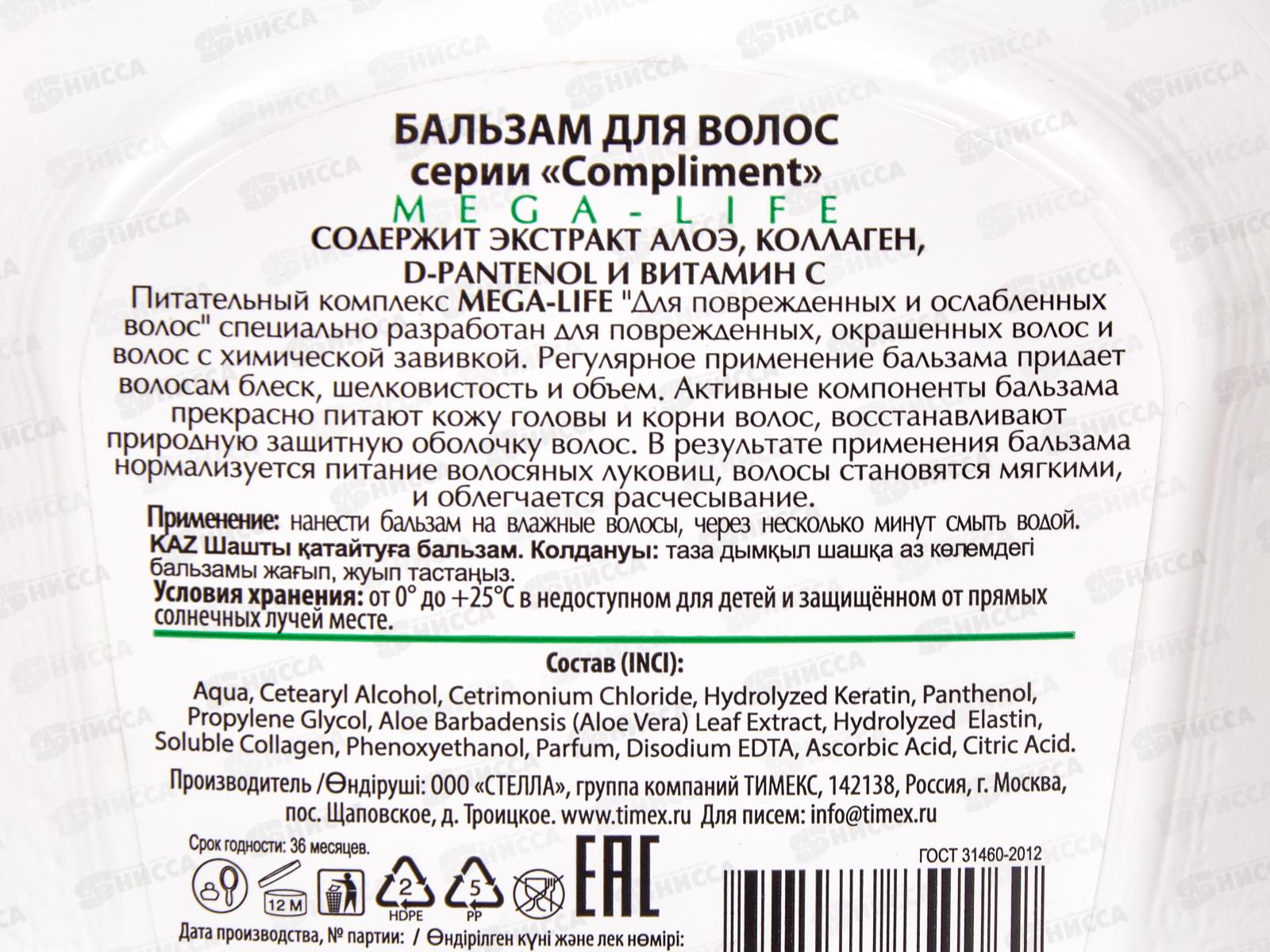 КОМПЛИМЕНТ Бальзам для волос Mega-Life 500мл для поврежденных и ослабленных *12