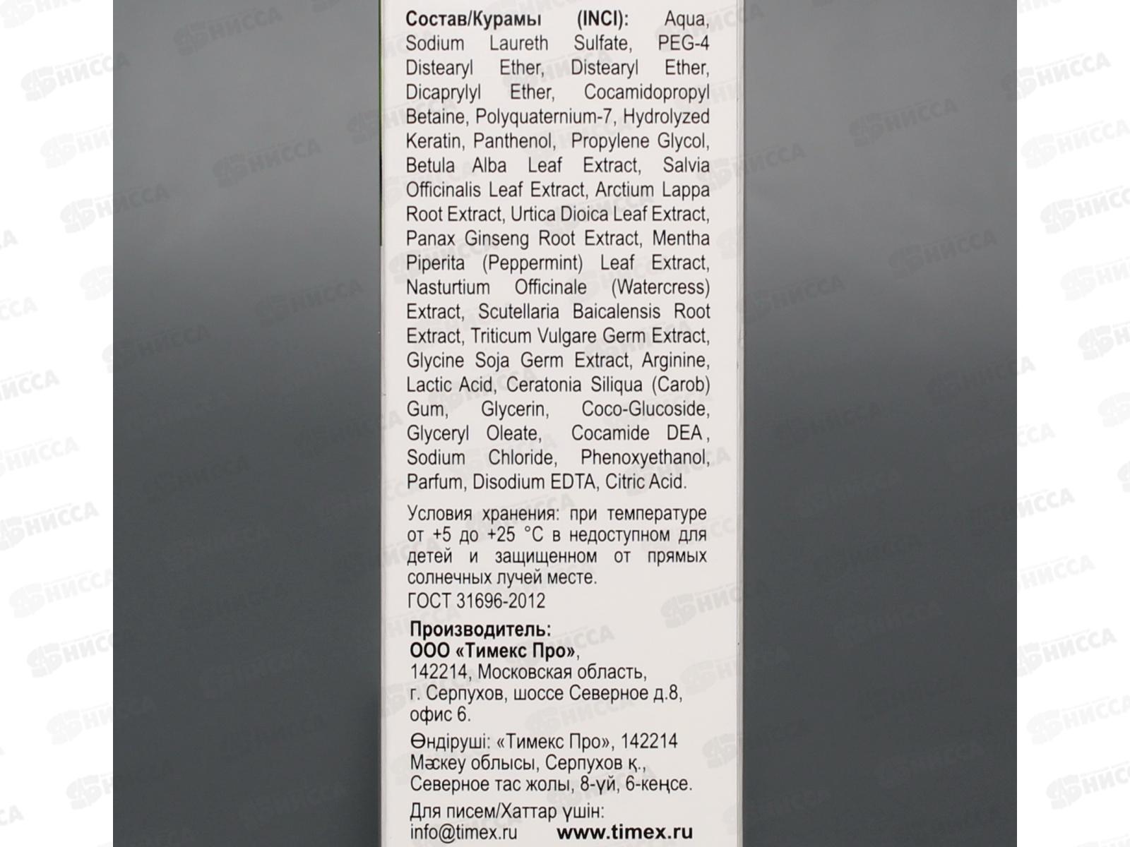 Состав: вода, Лауретсульфат натрия, Дистеариловый эфир ПЭГ-4, Дистеариловый эфир, Дикаприлиловый эфир, Кокамидопропилбетаин, Поликватерниум-7, Гидролизованный кератин, Пантенол, Пропиленгликоль, Экстракт листьев березы белой, Экстракт листьев шалфея лекарственного, Экстракт корня лопуха, Экстракт листьев крапивы двудомной, Экстракт корня женьшеня обыкновенного, Экстракт листьев мяты перечной (Mentha Piperita), Экстракт настурции лекарственной (Nasturtium Officinale), Экстракт корня шлемника байкальского, Экстракт зародышей пшеницы обыкновенной, Экстракт зародышей сои глицина, Аргинин, Молочная кислота, Камедь рожкового дерева (Ceratonia Siliqua), Глицерин, Кокоглюкозид, Глицерилолеат, Кокамид ДЭА, Хлорид натрия, Феноксиэтанол, отдушка, динатриевая ЭДТА, лимонная кислота.