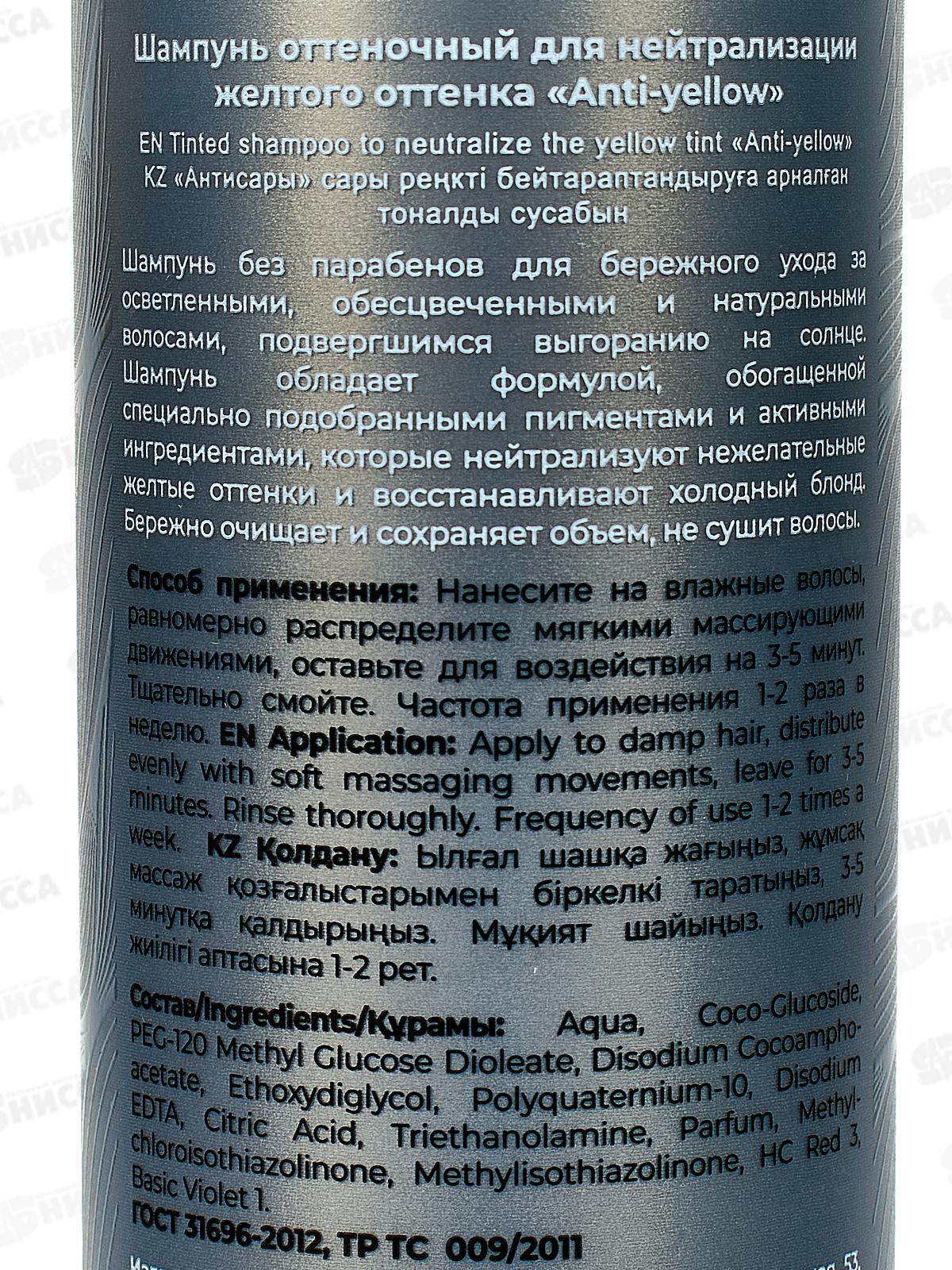 Состав: вода, кокоглюкозид, диолеат метилглюкозы ПЭГ-120, динатрий кокоамфоацетат, этоксидигликоль, поликватерниум-10, динатрий ЭДТА, лимонная кислота, триэтаноламин, отдушка, метилхлоризотиазолинон, метилизотиазолинон, HC красный 3, безалкогольный фиолетовый 1.