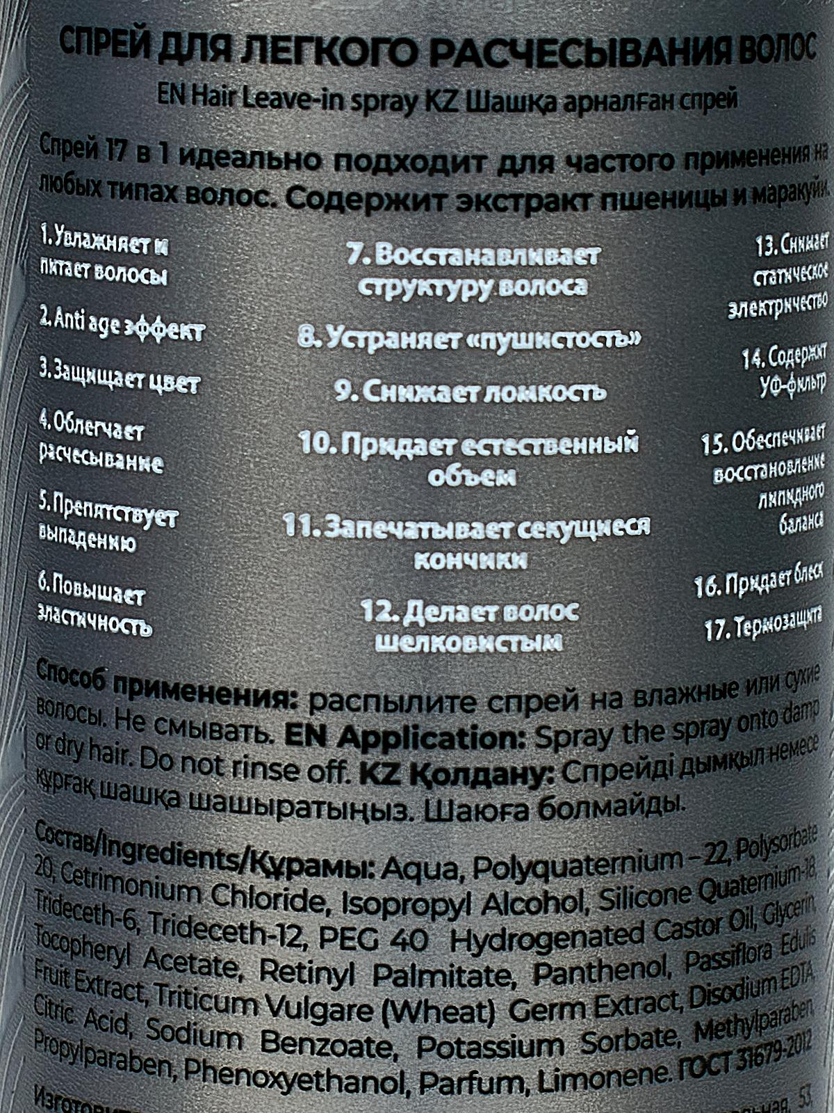 Состав: вода, Поликватерниум – 22, Полисорбат 20, Хлорид цетримония, Изопропиловый спирт, Силикон Кватерниум-18, Тридецет-6, Тридецет-12, ПЭГ 40 Гидрогенизированное касторовое масло, Глицерин, Токоферола ацетат, Ретинилпальмитат, Пантенол, Экстракт плодов Passiflora Edulis, Экстракт зародышей Triticum Vulgare (пшеницы), Динатриевая ЭДТА, Лимонная кислота, Бензоат натрия, Сорбат калия, Метилпарабен, Пропилпарабен, Феноксиэтанол, отдушка, Лимонен.