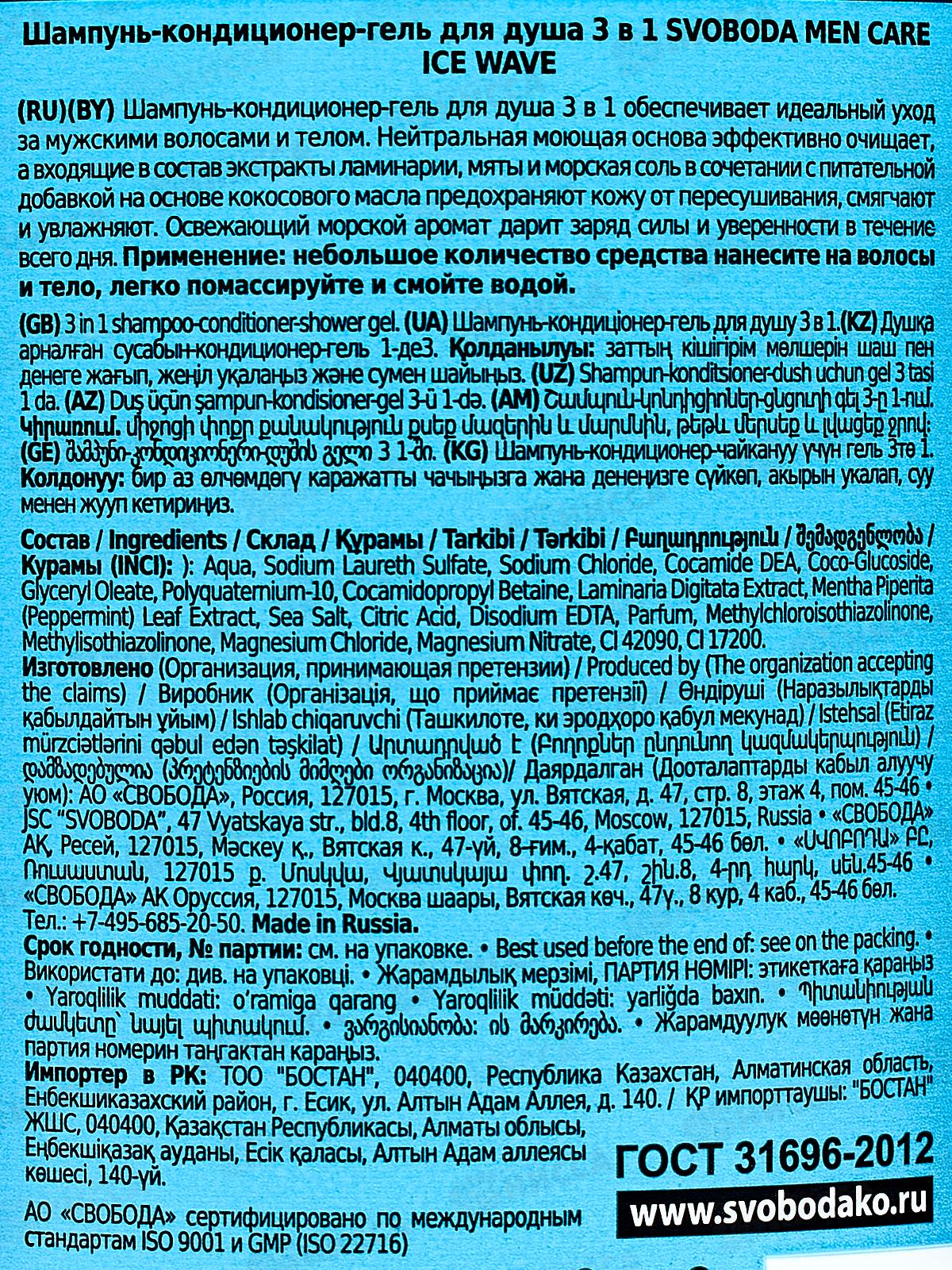 Свобода Шампунь-кондиционер-гель для душа 3в1 мужской Men care ice wave 290мл *10