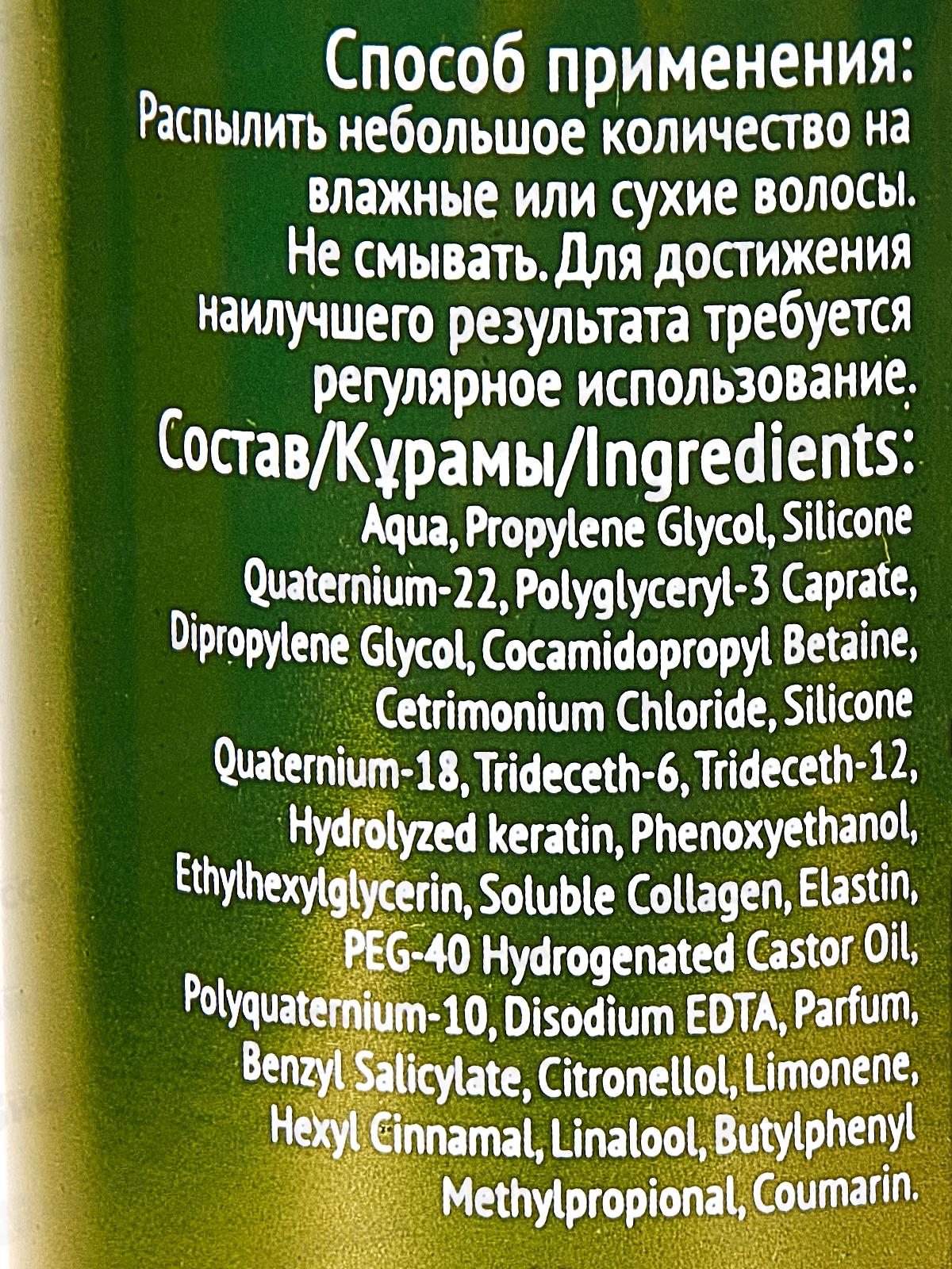 Состав: вода, Пропиленгликоль, силикон кватерниум-22, полиглицерил-3 капрат, дипропиленгликоль, кокамидопропилбетаин, цетримония хлорид, силикон кватерниум-18, тридецет-6, тридецет-12, гидролизованный кератин, феноксиэтанол, этилгексилглицерин, растворимый коллаген, эластин, ПЭГ-40 гидрогенизированное касторовое масло, поликватерниум-10, динатриевая ЭДТА, отдушка, бензилсалицилат, цитронеллол, лимонен, гексилциннамаль, линалоол, бутилфенилметилпропиональ, кумарин.