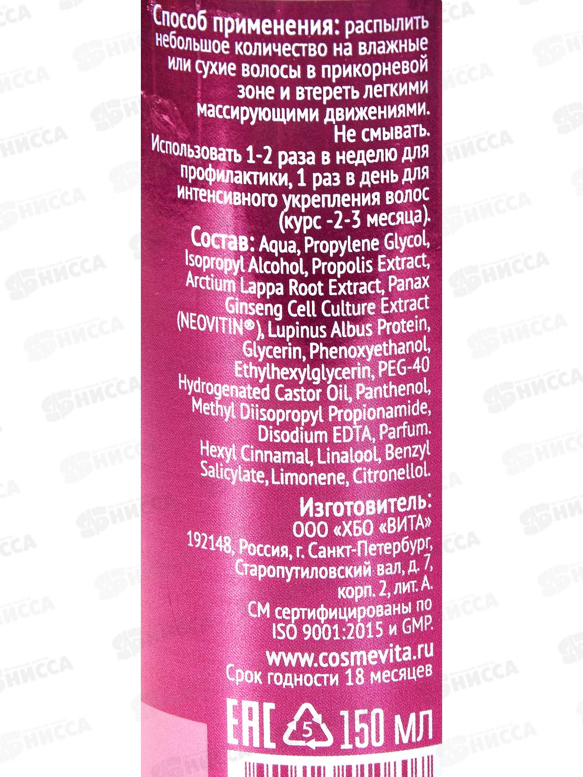 Состав: вода, Пропиленгликоль, изопропиловый спирт, экстракт прополиса, экстракт корня лопуха, экстракт культуры клеток женьшеня (NEOVITIN®), белок люпина белого, глицерин, феноксиэтанол, этилгексилглицерин, гидрогенизированное касторовое масло ПЭГ-40, пантенол, метилдиизопропилпропионамид, динатриевая ЭДТА, отдушка, гексилциннамаль, линалоол, бензилсалицилат, бутилфенилметилпропиональ, лимонен, цитронеллол.