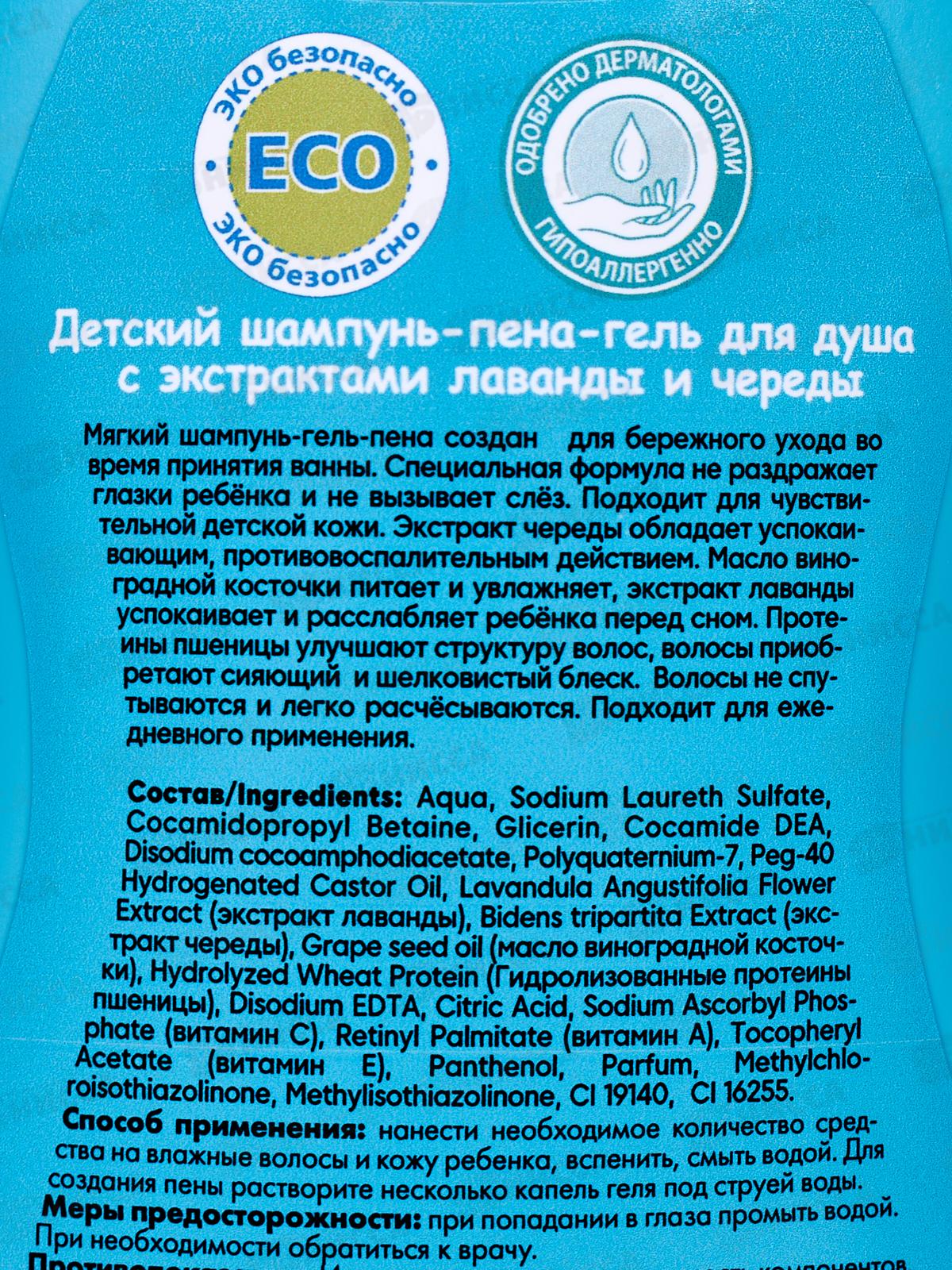 Состав: вода, лауретсульфат натрия, кокамидопропилбетаин, глицерин, кокамид ДЭА, кокоамфодиацетат динатрия, поликватерниум-7, гидрогенизированное касторовое масло Peg-40, экстракт цветков лаванды узколистной (экстракт лаванды), экстракт Bidens tripartita (экстракт череды), масло виноградных косточек (масло виноградной косточки), гидролизованная пшеница. Белок (Гидролизованные протеины пшенишы), динатрия ЭДТА, лимонная кислота, аскорбилфосфат натрия (витамин С), ретинилпальмитат (витамин А), тософерилацетат (витамин Е), пантенол, отдушка, метилхлоризотиазолинон, метилизотиазолинон, CI 19140, CI. 16255.