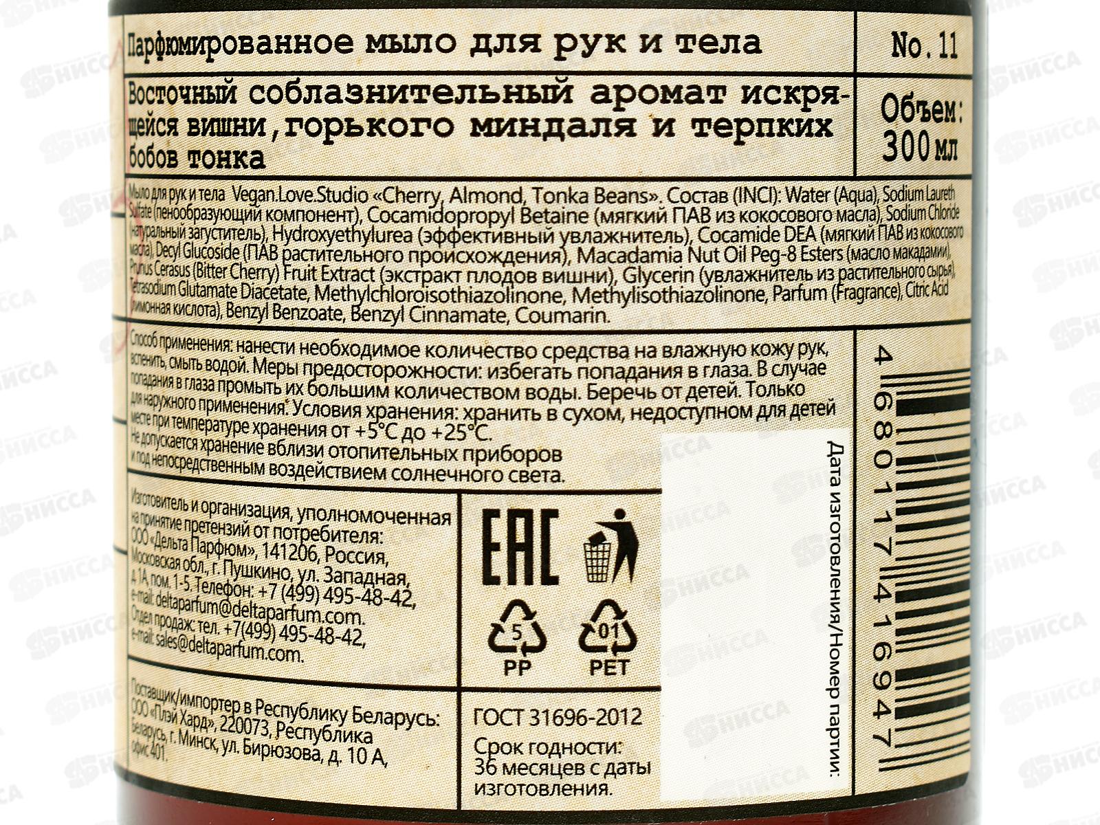 Vegan L.S. Мыло для рук и тела Studio Cherry Almond Tonika Bean 300мл *16