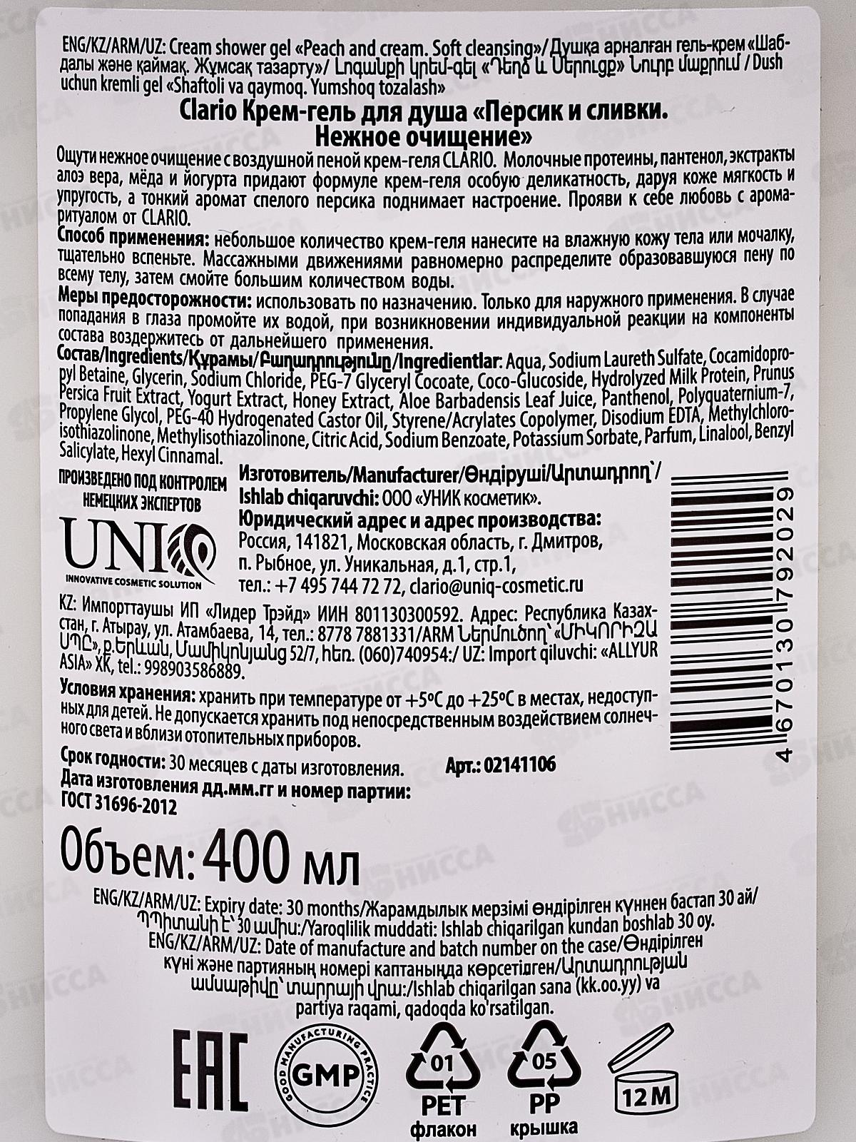 Clario Крем-гель для душа Персик и сливки Нежное очищение 400мл *5