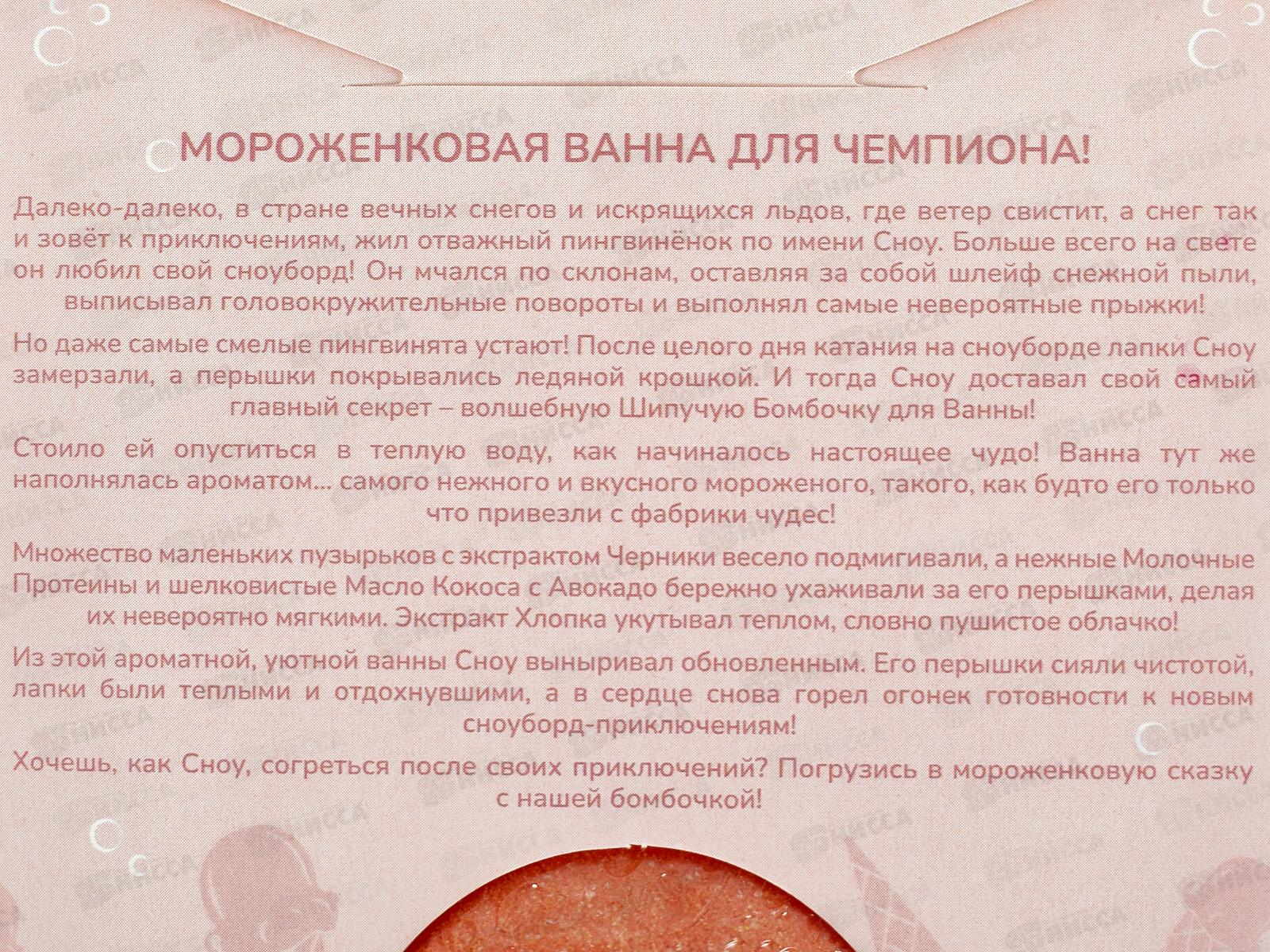 Состав: гидрокарбонат натрия, лимонная кислота, экстракт черники, молочные протеины, масло кокоса, экстракт хлопка, масло авокадо, отдушка, краситель, слюда.