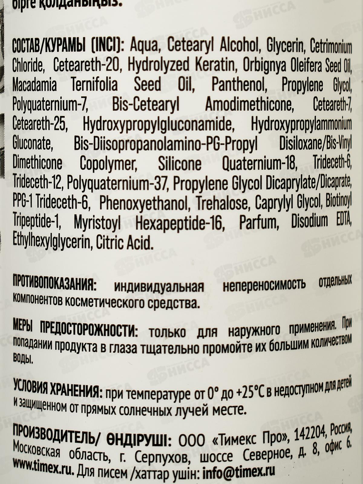 Состав: Вода, Цетеариловый спирт, Глицерин, Цетримуний хлорид, Цетеарет-20, Гидролизованный кератин, Масло бабасу, Масло макадамии, Пантенол, Пропиленгликоль, Поликватерниум 7, Бис-цетеариламодиметикон, Цетеарет-7, Цетеарет-25, Гидроксипропилглюконамид, Гидроксипропиламмония глюконат, Сополимер Бис-диизопропаноламино-ПГ-пропилдисилоксана/Бис-винилдиметикона, Силикон-кватерниум-18, Тридецет-6, Тридецет-12, Поликватерниум 37, Пропиленгликоль Дикаприлат/дикапрат, ППГ-1 Тридецет -6, Феноксиэтанол, Трегалоза, Каприлгликоль, Биотиноилтрипептид-1, Миристоилгексапептид-16, Отдушка, Динатрий ЭДТА, Этилгексилглицерин, Лимонная кислота.