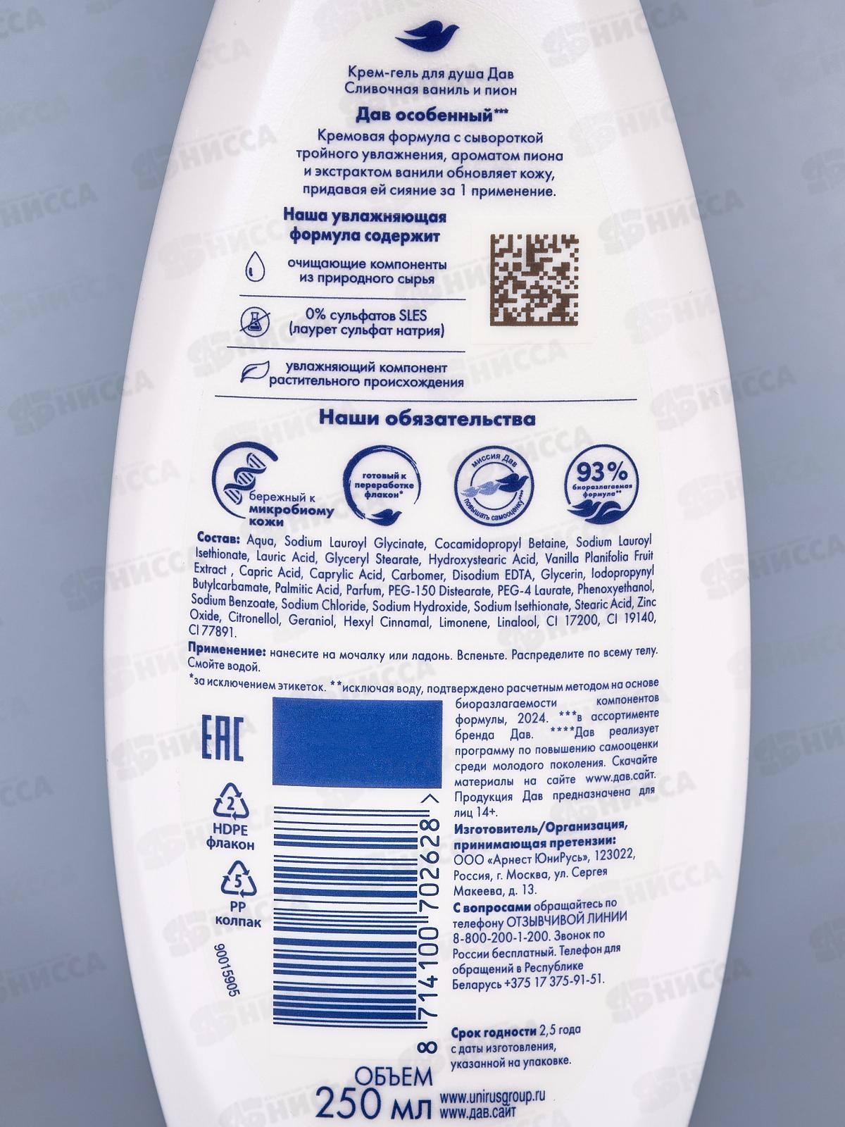 ДАВ крем-гель для душа 250мл Пион и масло розы *12
