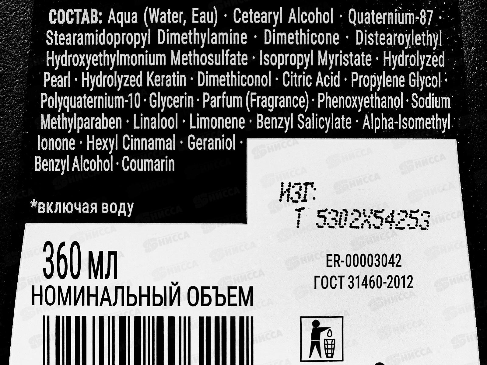 Состав: вода, цетеариловый спирт, кватерниум-87, стеарамидопропилдиметиламин, диметикон, дистеароилэтилгидроксиэтилмония метосульфат, изопропилмиристат, гидролизованный жемчуг, гидролизованный кератин, диметиконол, лимонная кислота, пропиленгликоль, поликватерниум-10, глицерин, парфюмерная композиция (ароматизатор), феноксиэтанол, метилпарабен натрия, линалоол, лимонен, бензилсалицилат, альфа-изометилионон, гексилциннамаль, гераниол, бензиловый спирт, кумарин.