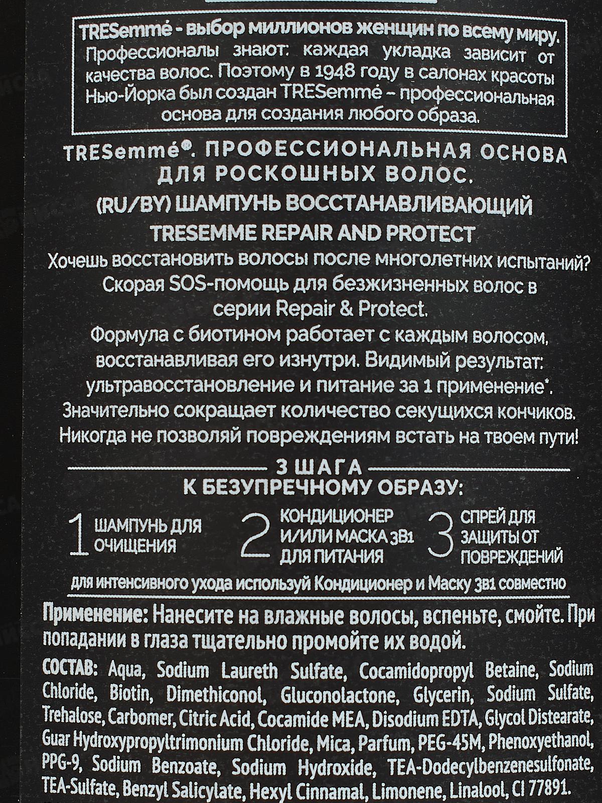 Состав: вода, лауретсульфат натрия, кокамидопропилбетаин, хлорид натрия, аргинин, биотин, церамид NP, диметиконол, глюконолактон, глицерин, лизин HCl, сульфат натрия, трегалоза, карбомер, лимонная кислота, кокамид MEA, динатрий ЭДТА, гликоль дистеарат, гуар гидроксипропилтримония хлорид, слюда, парфюмерная композиция, ПЭГ-45М, феноксиэтанол, ППГ-8, бензоат натрия, гидроксид натрия, TEA-додецилбензолсульфонат, бензилсалицилат, гексилциннамаль, лимонен, линалоол, CI 77891.