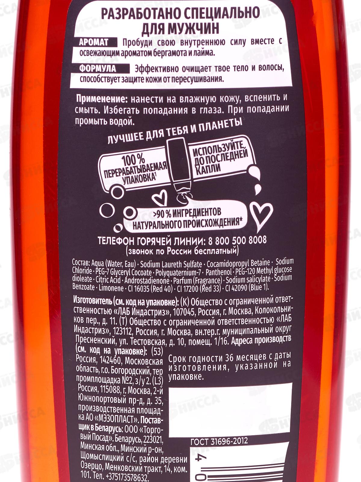 Состав: вода, лауретсульфат натрия, кокамидопропилбетаин, хлорид натрия, андростадиенон, парфюмерная композиция (ароматизатор), бензоат натрия, салицилат натрия, ПЭГ-7 глицерил кокоат, лимонная кислота, кокамидопропилбетаин, лаурат глицерина, лимонен, линалоол, Cl 16035 (красный 40), Cl 17200 (красный 33), CI 42090 (синий 1).