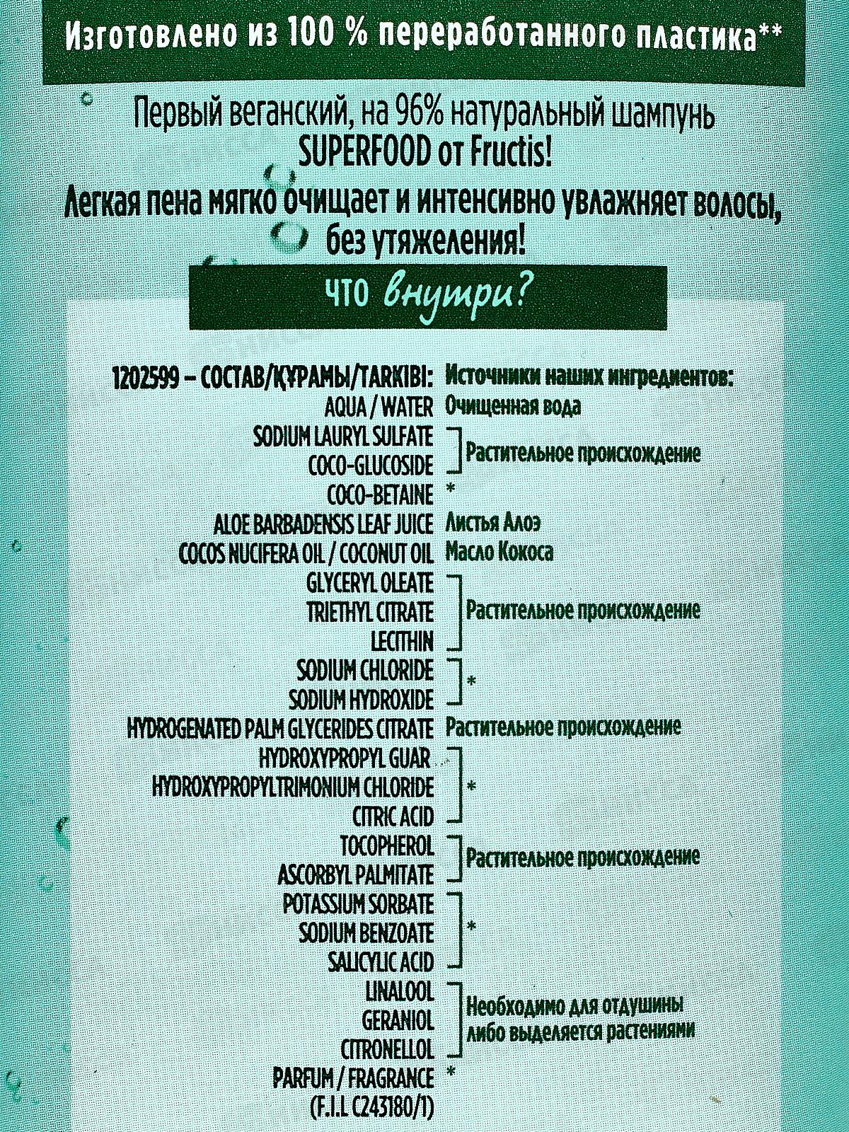 Состав: вода, лаурилсульфат натрия, коко-глюкозид, коко-бетаин, сок листьев алое варбаденсис, масло кокосового масла / кокосовое масло, глицерил олеат, триэтилцитрат, лецитин, хлорид натрия, гидроксид натрия, гидрогенизированные пальмовые глицериды цитрат, гидроксипропил гуар гидроксипропилтримония хлорид, лимонная кислота, токоферол, аскорбилпальмитат, сорбат калия, бензоат натрия, салициловая кислота, линалоол, гераниол, цитронеллол, отдушка.