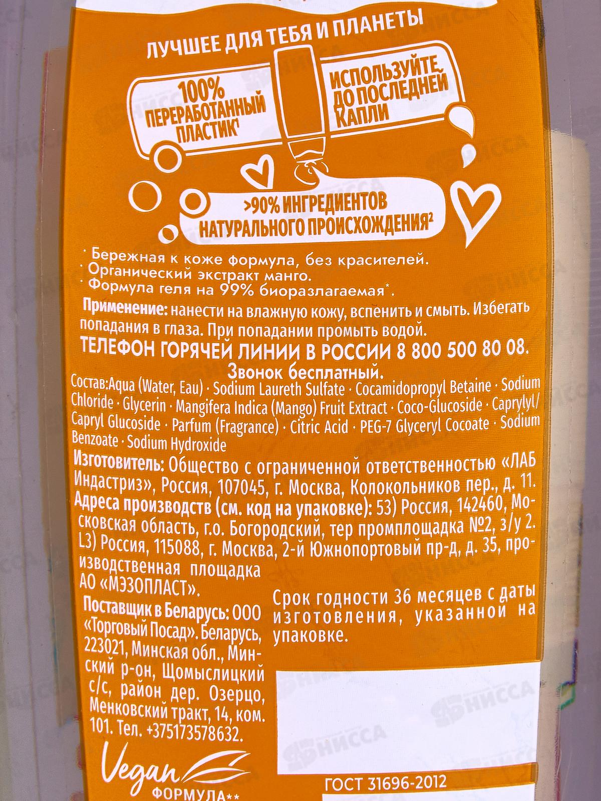 Состав: вода, лауретсульфат натрия, кокамидопропилбетаин, хлорид натрия, глицерин, экстракт плодов манго (Mangifera Indica), кокоглюкозид, каприлил/каприловый глюкозид, парфюмерная композиция (ароматизатор), лимонная кислота, ПЭГ-7 глицерил кокоат, бензоат натрия, гидроксид натрия.