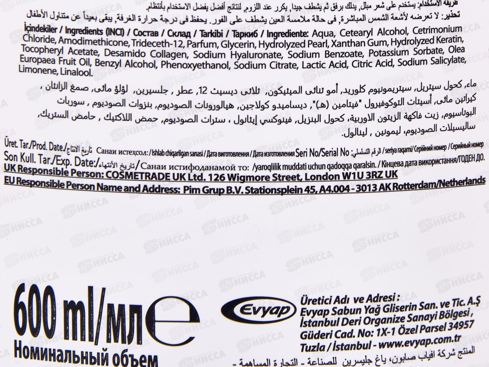 Состав: вода, цетеариловый спирт, хлорид цетримония, амодиметикон, тридецет-12, парфюмерная композиция, глицерин, гидролизованный жемчуг, ксантановая камедь, гидролизованный кератин, токоферилацетат, дезамидоколлаген, гиалуронат натрия, бензоат натрия, сорбат калия, масло плодов оливы европейской, бензиловый спирт, феноксиэтанол, цитрат натрия, молочная кислота, лимонная кислота, салицилат натрия, лимонен, линалоол.