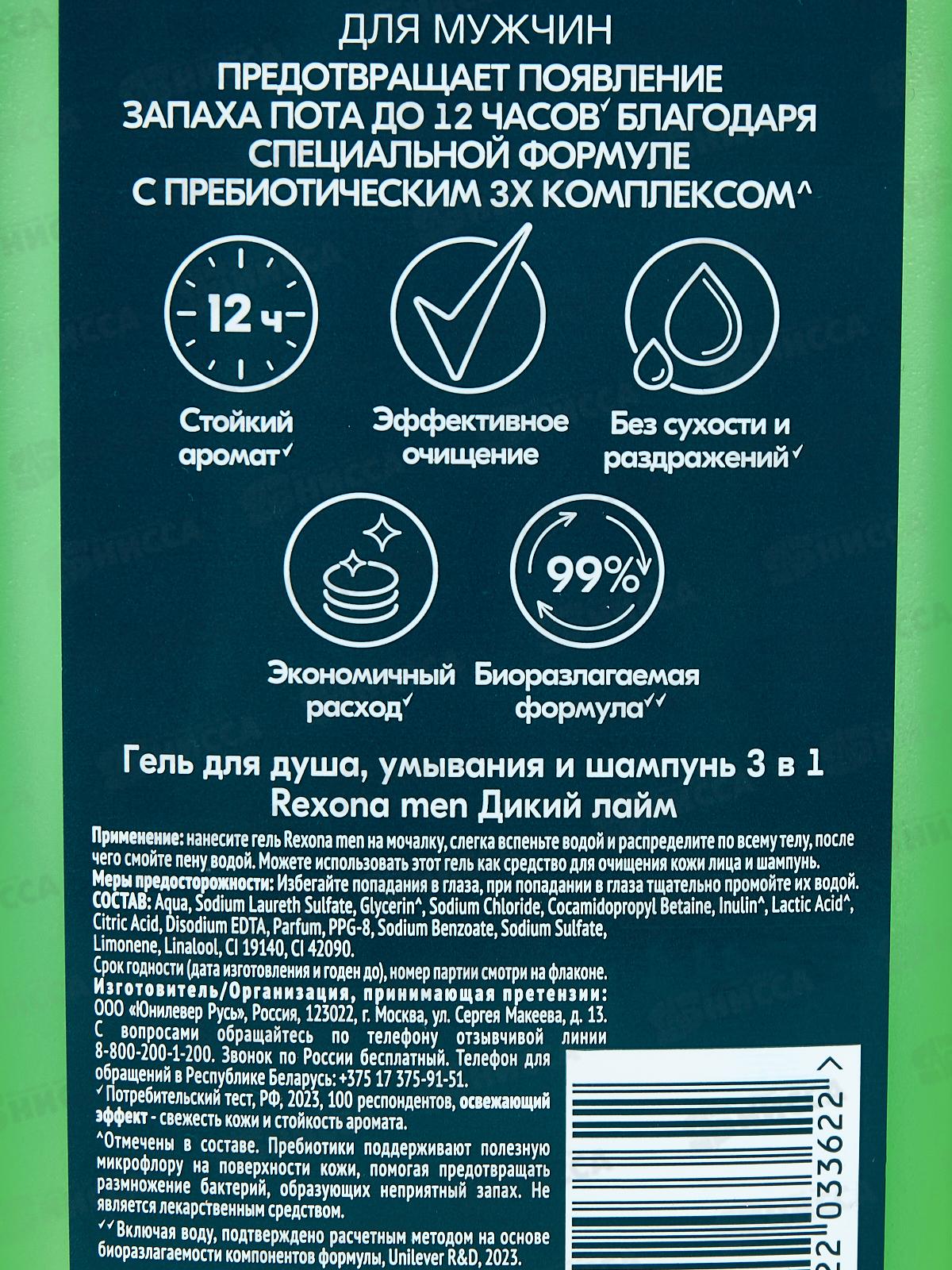 Рексона гель для душа men 490мл 3в1 Дикий лайм *6