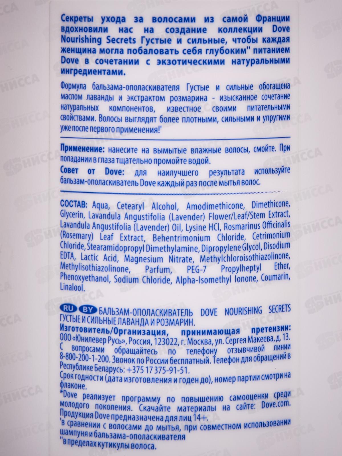 Состав: вода, цетеариловый спирт, амодиметикон, диметикон, глицерин, экстракт цветков/листьев/стеблей лаванды (Lavandula Angustifolia), масло лаванды (Lavandula Angustifolia), гидрохлорид лизина, экстракт листьев розмарина (Rosmarinus Officinalis), стеарамидопропилдиметиламин, хлорид бегентримония, хлорид цетримония, дипропиленгликоль, динатриевая соль ЭДТА, молочная кислота, хлорид магния, нитрат магния, метилхлоризотиазолинон, метилизотиазолинон, парфюмерная композиция, пропилгептиловый эфир ПЭГ-7, феноксиэтанол, пропиленгликоль, хлорид натрия, альфа-изометиллон, кумарин, линалоол.