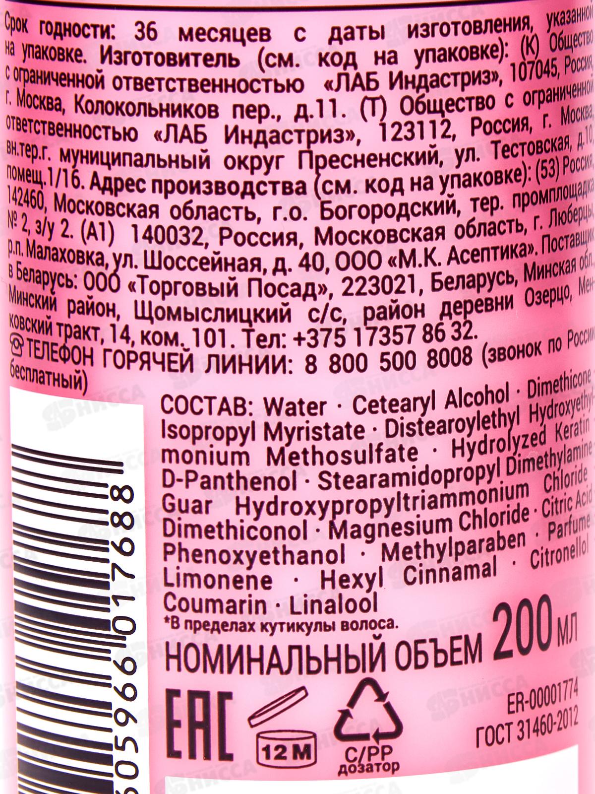Состав: вода, цетеариловый спирт, диметикон, изопропилмиристат, дистеароилэтилгидроксиэтилмония метосульфат, гидролизованный кератин, D-пантенол, стеарамидопропилдиметиламин, гуар, гидроксипропилтриаммония хлорид, диметиконол, хлорид магния, лимонная кислота, феноксиэтанол, метилпарабен, парфюмерная композиция, лимонен, гексилциннамаль, цитронеллол, кумарин, линалоол.