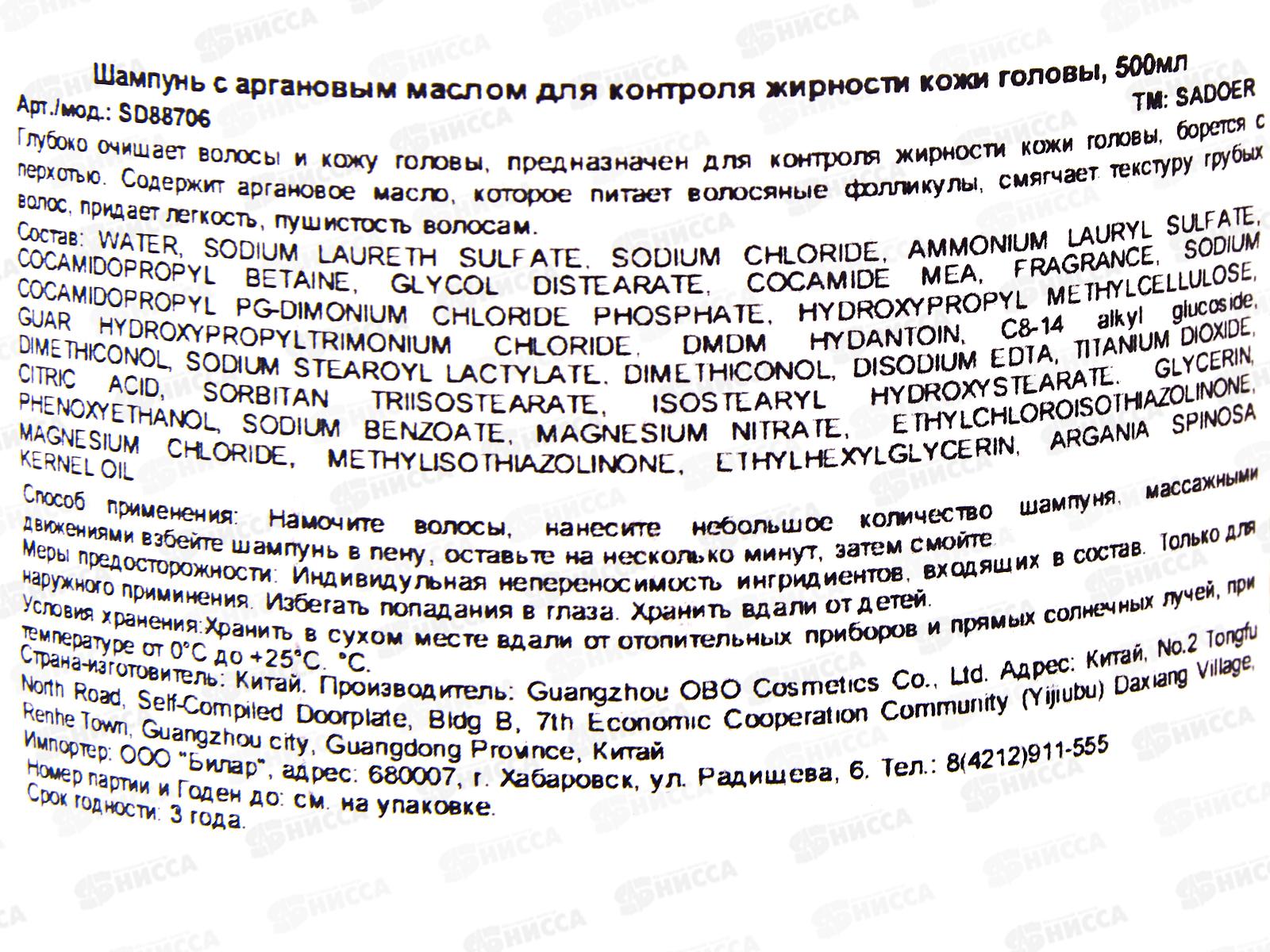 OBO Sadoer Шампунь для волос против перхоти Argan Oil 500мл дозатор