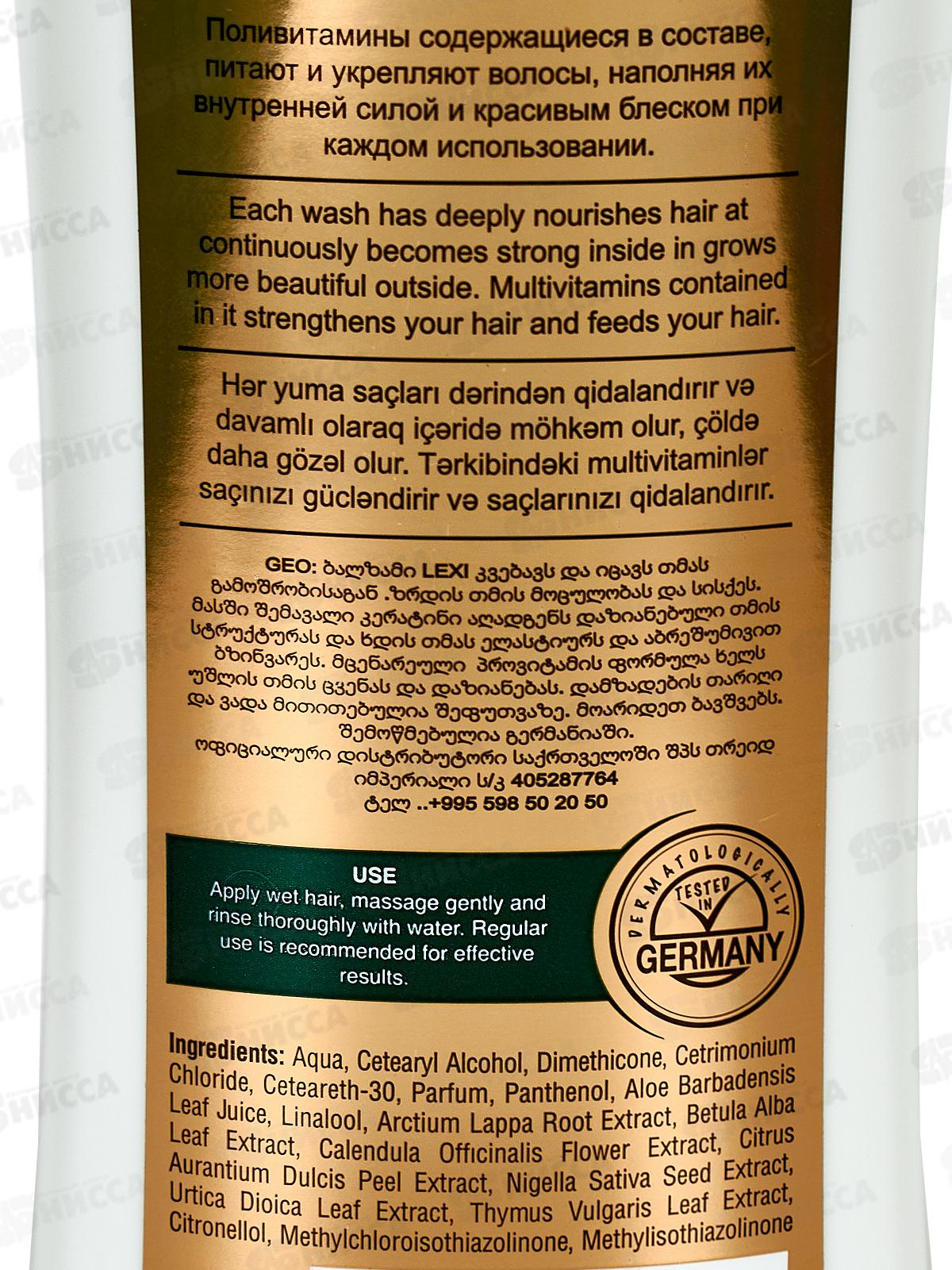 Состав: вода, цетеариловый спирт, диметикон, цетримония хлорид, цетеарет-30, парфюмерная композиция, пантенол, алоэ вера, сок листьев, линалоол, экстракт корня лопуха, экстракт березы белой, экстракт цветков календулы лекарственной, экстракт кожуры сладкого померанца, экстракт семян черного тмина, экстракт листьев крапивы двудомной, экстракт листьев тимьяна обыкновенного, цитронеллол, метилхлоризотиазолинон, метилизотиазолинон.