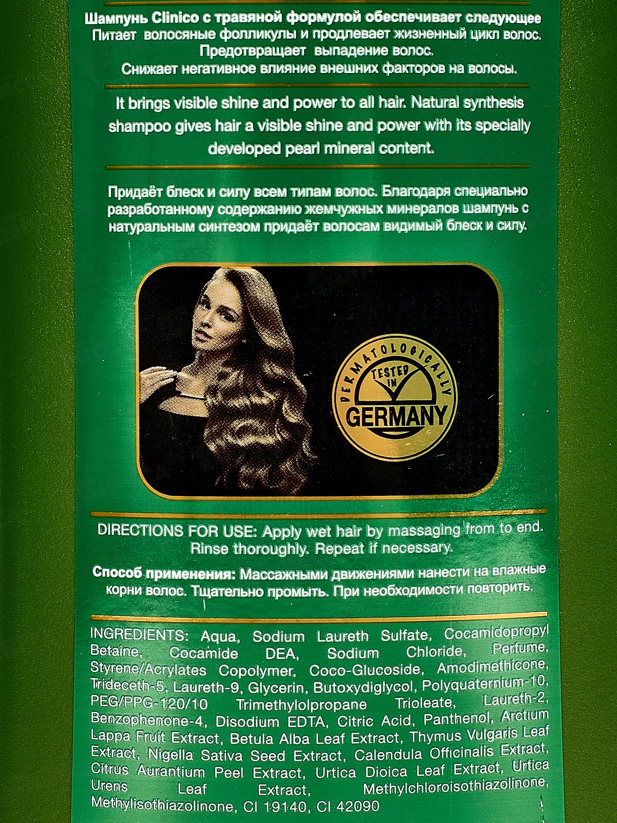 Состав: вода, лауретсульфат натрия, кокамидопропилбетаин, кокамид ДЭА, хлорид натрия, парфюмерная композиция, сополимер стирола/акрилатов, коко-глюкозид, амодиметикон, тридецет-5, лаурет-9, глицерин, бутоксидигликоль, поликватерниум-10, триолеат триметилолпропана ПЭГ/ППГ-120/10, лаурет-2, бензофенон-4, динатрий ЭДТА, лимонная кислота, пантенол, экстракт плодов лопуха, экстракт листьев березы белой, экстракт листьев тимьяна обыкновенного, экстракт семян чернушки посевной, экстракт календулы лекарственной, экстракт кожуры померанца, экстракт листьев крапивы двудомной, экстракт листьев крапивы уртической, метилхлоризотиазолинон, метилизотиазолинон, Cl 19140, 42090.