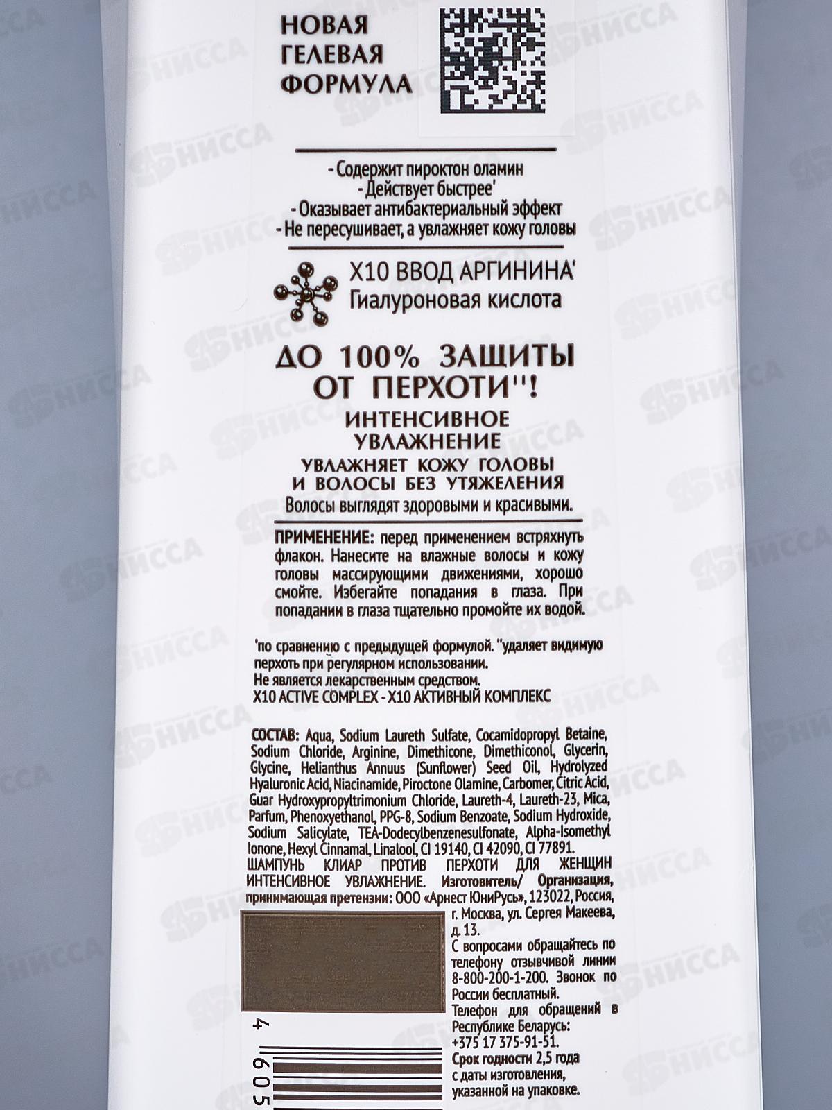Состав: вода, лауретсульфат натрия, кокамидопропилбетаин, диметиконол, пиритион цинка, диметикон, хлорид натрия, парфюмерная композиция, карбомер, гидроксид натрия, ДМДМ-гидантоин, лимонная кислота, гуар гидроксипропилтримония хлорид, TEA-додецилбензолсульфонат, сульфат цинка, PPG-12, TEA-сульфат, полоксамер 407, лаурет-23, лаурет-4, глицерин, пантенол, циклопентасилоксан, бензоат натрия, полинафталинсульфонат натрия, масло семян подсолнечника (Helianthus Annuus), ПЭГ-9М, ксантановая камедь, токоферилацетат, гидрохлорид лизина, метилизотиазолинон, целлюлозная камедь, пантолактон, Пиридоксина гидрохлорид, аскорбилфосфат натрия, озонированный экстракт каллусной культуры Pereskia Grandifolia, метилхлоризотиазолинон, феноксиэтанол, бутилфенилметилпропиональ, гексилциннамаль, линалоол, CI 47005, CI 42090.
