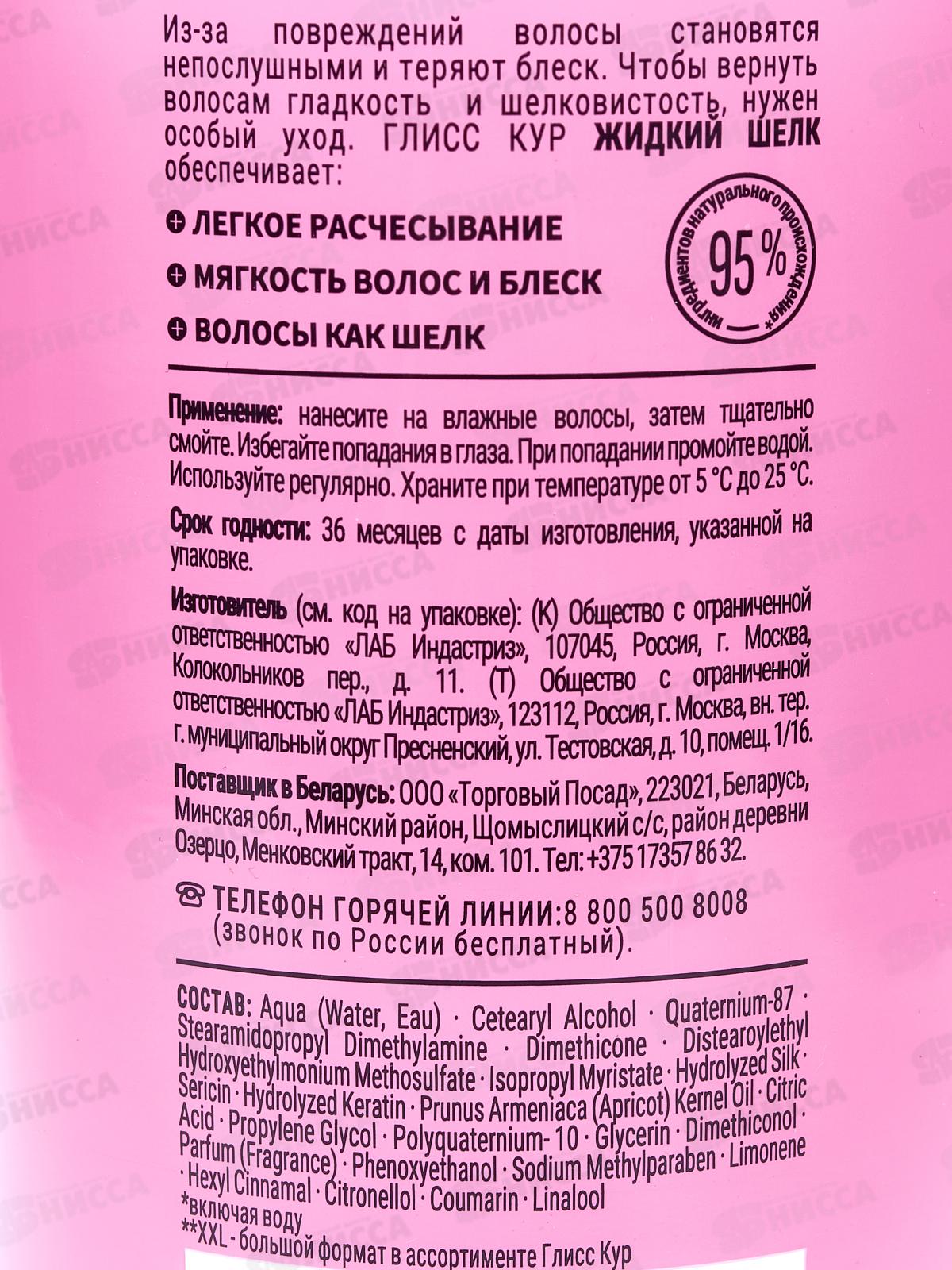 Состав: вода, Цетеариловый спирт, кватерниум-87, стеарамидопропилдиметиламин, диметикон, дистеароилэтилгидроксиэтилмония метосульфат, изопропилмиристат, гидролизованный шелк, серицин, гидролизованный кератин, масло косточек абрикоса (Prunus Armeniaca), лимонная кислота, пропиленгликоль, поликватерниум-10, глицерин, диметиконол, парфюмерная композиция (ароматизатор), феноксиэтанол, метилпарабен натрия, лимонен, гексилциннамаль, цитронеллол, кумарин, линалоол.