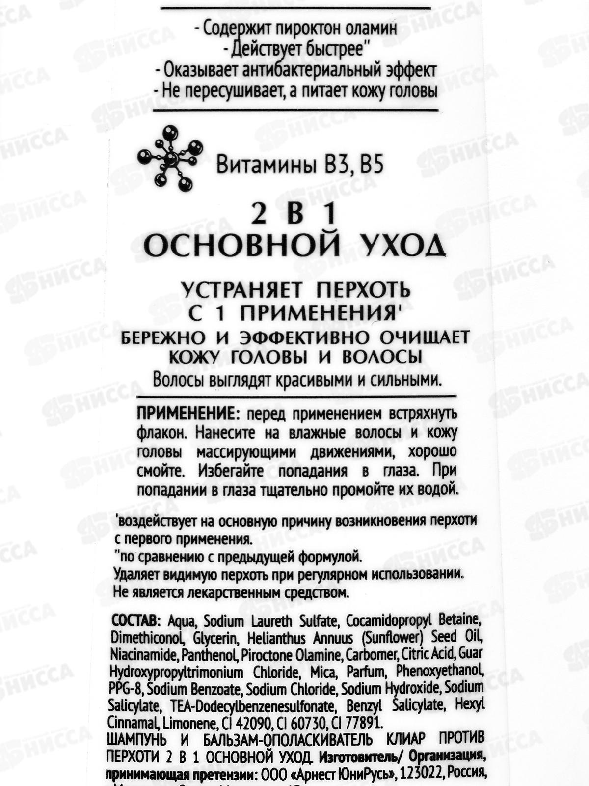Состав: вода, лауретсульфат натрия, кокамидопропилбетаин, хлорид натрия, диметиконол, глицерин, масло семян подсолнечника, ментол, ниацинамид, пантенол, пиритион цинка, сульфат цинка, карбомер, лимонная кислота, гуар гидроксипропилтримониум хлорид, отдушка, феноксиэтанол, ППГ-9, бензоат натрия, гидроксид натрия, натрия полинафталинсульфонат, салицилат натрия, ТЭА-додецилбензолсульфонат, ТЭА-сульфат, бензилсалицилат, гексилциннамаль, лимонен, CI 42090, CI 47005