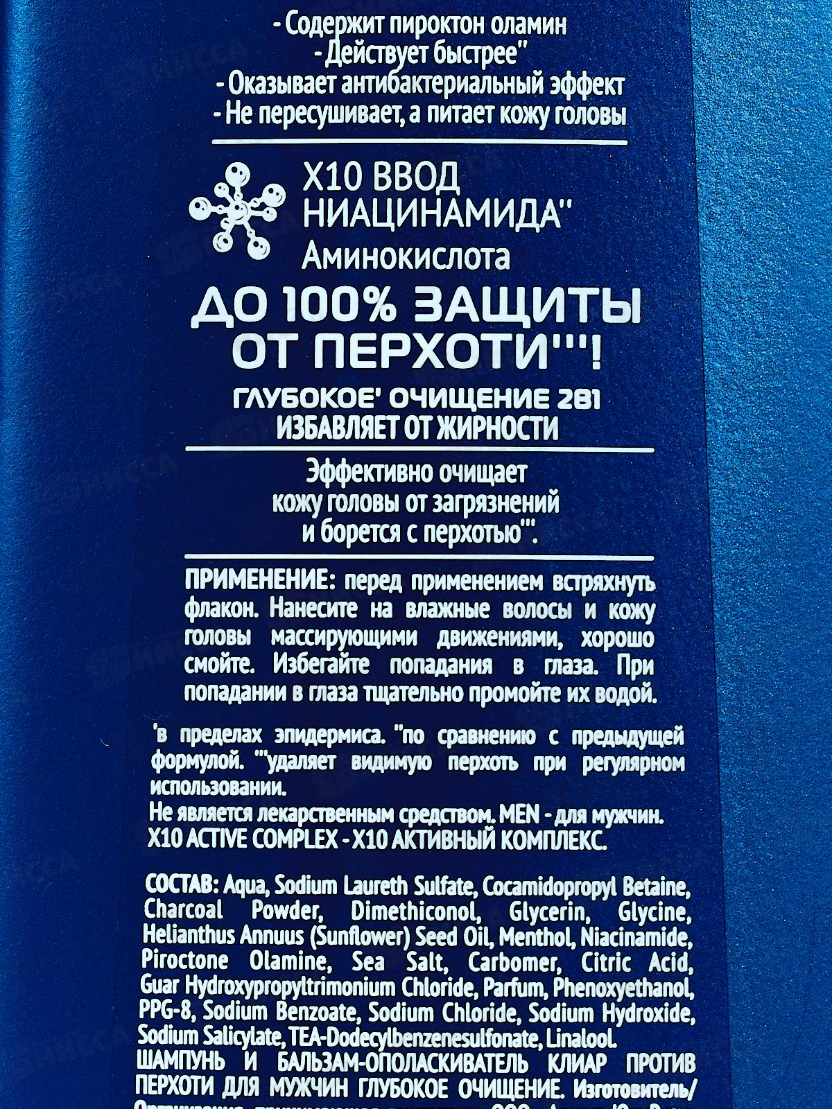 Состав: вода, лауретсульфат натрия, кокамидопропилбетаин, пиритион цинка, диметиконол, хлорид натрия, пропиленгликоль, карбомер, диметикон, парфюмерная композиция, гуар гидроксипропилтримония хлорид, климбазол, ментол, TEA-додецилбензолсульфонат, TEA-сульфат, феноксиэтанол, йодопропинилбутилкарбамат, полоксамер 407, лаурет-23, лаурет-4, ПЭГ-4, ксантановая камедь, целлюлозная камедь, полинафталинсульфонат натрия, экстракт листьев перечной мяты (Mentha Piperita), экстракт корня женьшеня (Panax Ginseng), токоферилацетат, масло семян подсолнечника (Helianthus Annuus), пантенол, масло листьев чайного дерева (Melaleuca Alternifolia), Пантолактон, глицерин, уголь, сульфат цинка, лимонная кислота, мальтодекстрин, гидроксид натрия, ДМДМ-гидантоин, бензоат натрия, сорбат калия, метилизотиазолинон, ППГ-9, бутилфенилметилпропиональ, кумарин, лимонен, линалоол.