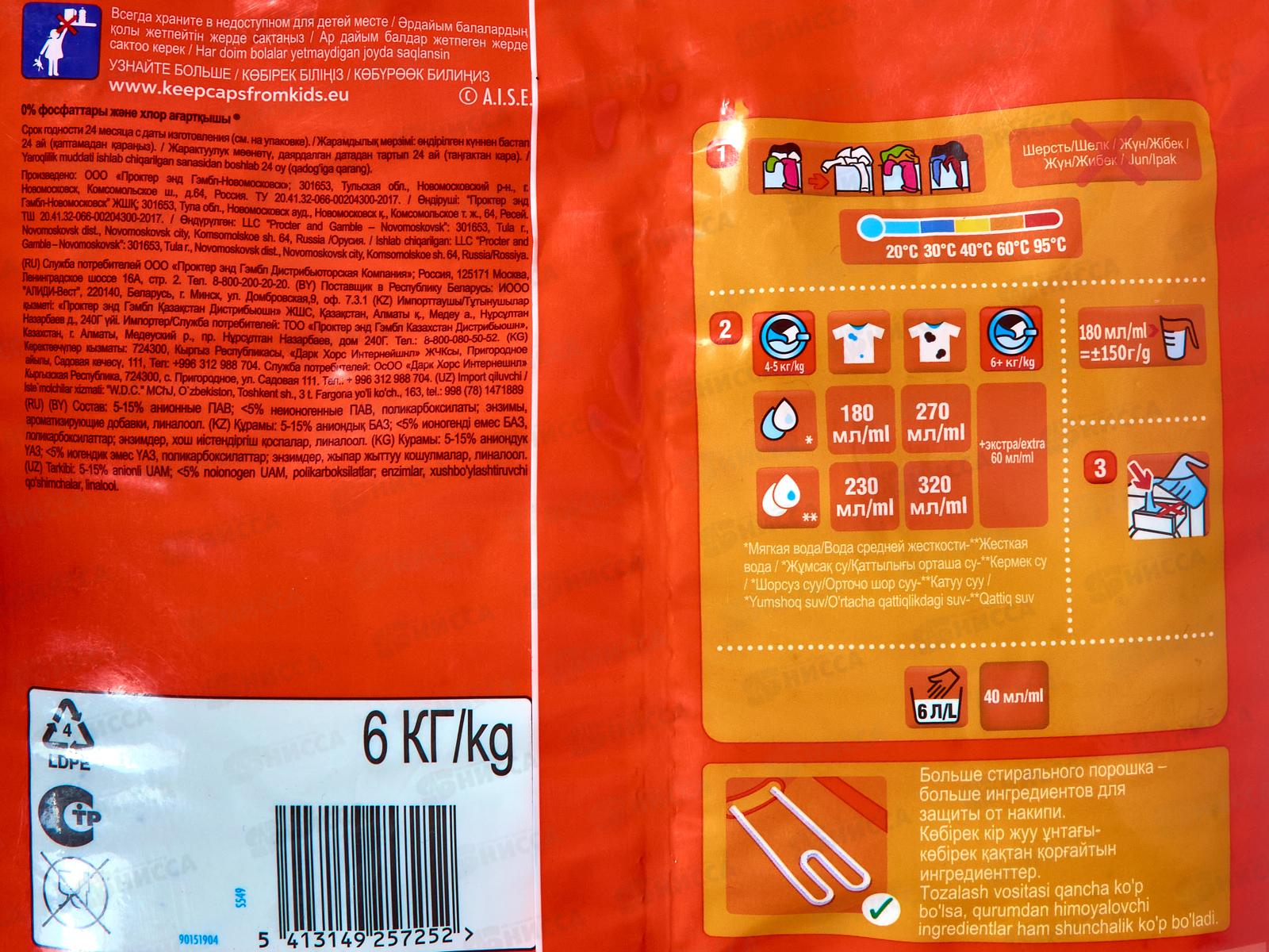 Состав: 5–15% анионные ПАВ, менее 5% неионогенные ПАВ, поликарбоксилаты, энзимы, ароматизирующие добавки, линалоол.