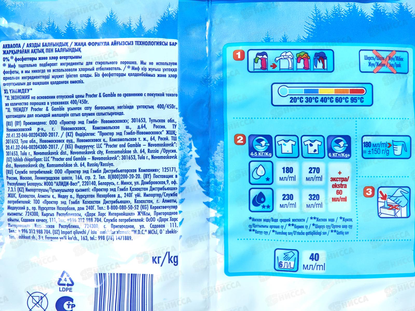 Стиральный порошок Миф отлично отстирывает одежду всей семьи, придавая ей свежесть. Технология M-ZiM7 расщепляет и удаляет даже самые трудновыводимые пятна, при этом вещи приобретают приятный природный аромат морозной свежести. Стиральный порошок Миф дарит безупречную чистоту, которую можно увидеть и почувствовать. Он предназначен для стирки в стиральных машинах любого типа. Содержит комплекс современных отбеливателей: кислородный, оптический, а также фотоотбеливатель, благодаря которым бельё становится чистым и свежим. Эффективно отстирывает различные пятна, а специальные отбеливатели, входящие в его состав, сохраняют цвета вещей яркими. Отлично отстирывает даже в холодной воде, потому что содержит специальные энзимы, которые начинают работать уже при низких температурах, а также защищают стиральную машину от накипи и известкового налёта.