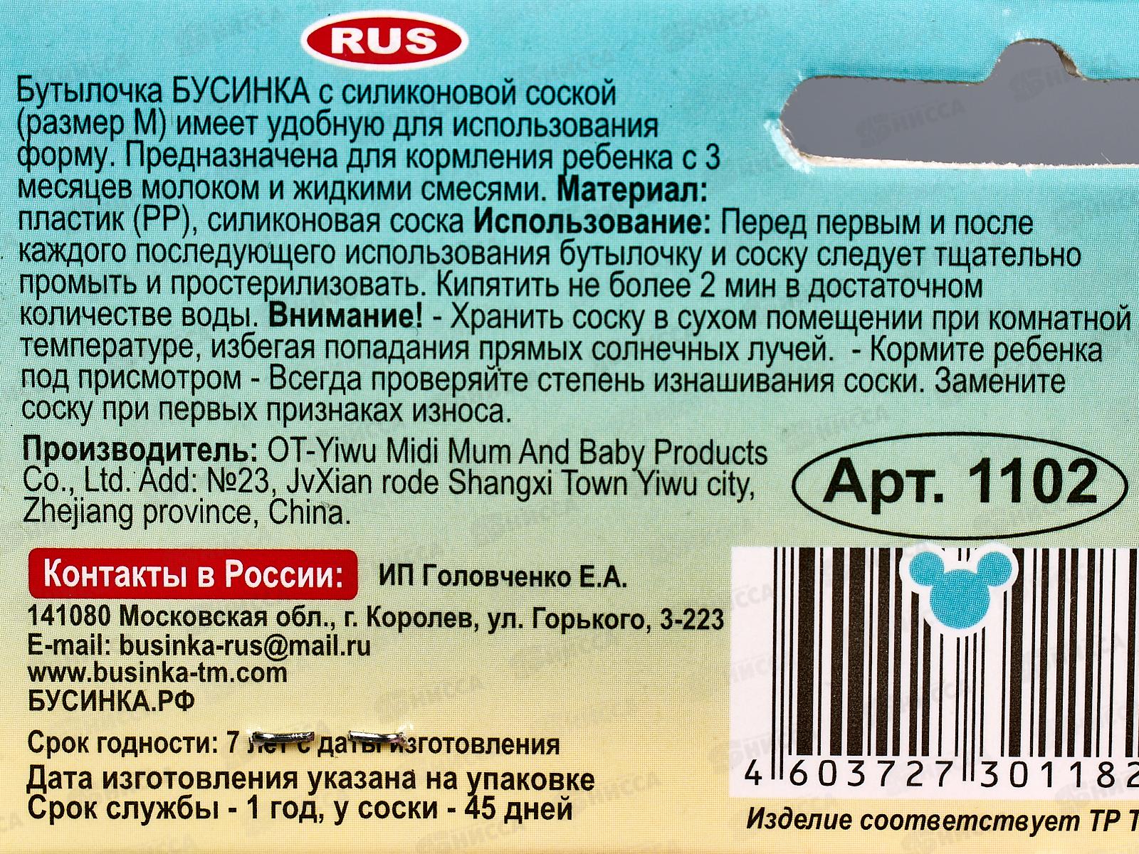ТМ «БУСИНКА» - это качественная продукция производства Таиланда, Китая, России. Постоянно обновляющийся ассортимент, яркость упаковки, оригинальность дизайна, доступная цена – все это создает востребованность продукции «БУСИНКА» на рынке детских товаров. Бутылочка с силиконовой соской (размер М) имеет удобную для использования форму. Предназначена для кормления ребенка молоком и жидкими смесями.