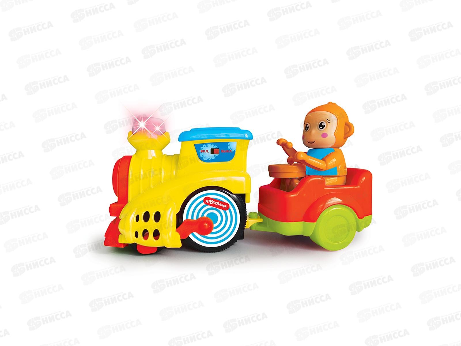 Веселый паровозик едет сам – и ему не нужны рельсы! Просто включи игрушку – и вперед! Паровозик гудит и стучит колесами, как настоящий, поет веселые и познавательные песенки, играет мелодии с веселыми звуками, а еще у него светится труба! В поезде едет пассажир – забавная обезьянка, она играет на барабане и крутит головой. Малыш сможет подпевать песенки про алфавит и счет, бегать за паровозиком, играть и веселиться! Вагончик с обезьянкой можно прицеплять и отцеплять по желанию.