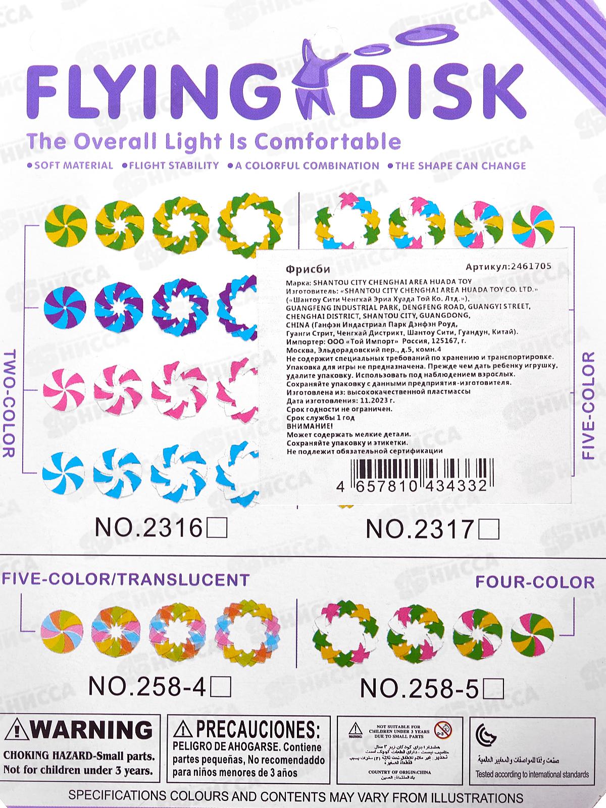 Летающая тарелка Фрисби 4 цв., 2461705 на блистере 18,4*14,8*1см