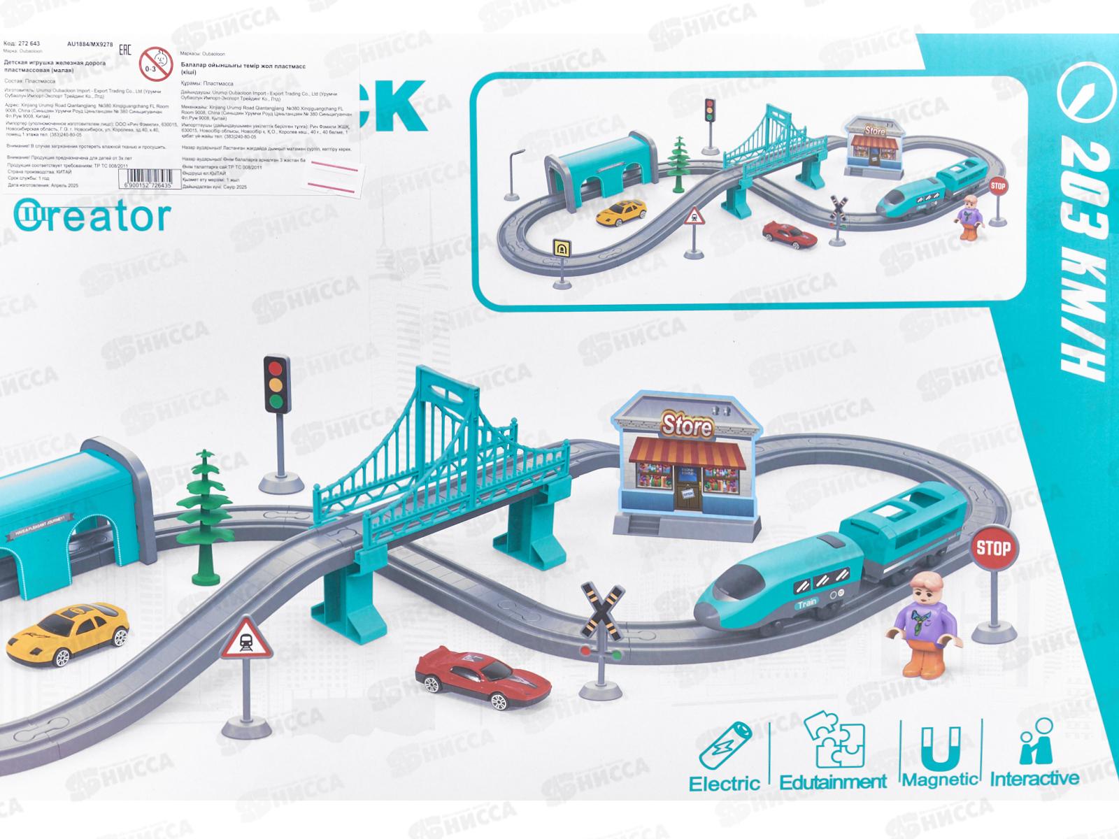 Комплектация: локомотив - 1 шт, вагон - 1 шт, машина - 2 шт, фигурка, детали для сборки железной дороги (сегменты дороги, мост, опоры, тоннель), декорации (макет магазина из картона, дорожные знаки, фонарь, светофор, деревья, наклейки)