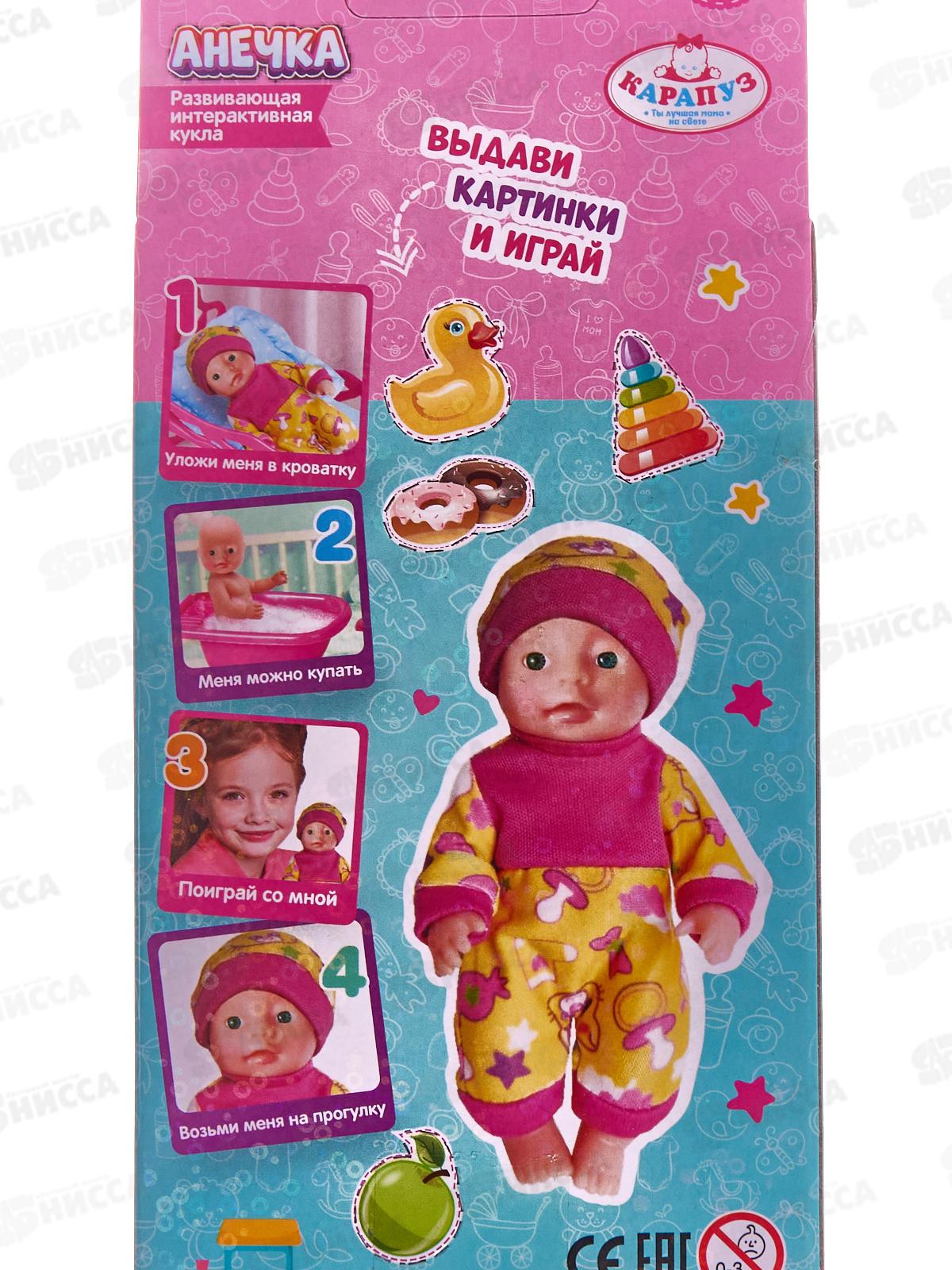 Развивающий пупс с аксессуарами Анечка станет прекрасным подарком для вашего ребёнка: произносит 2000 слов, пьёт из бутылочки, писает. На обороте коробки есть подарок. Этот милый пупс, с детально проработанным личиком, обязательно понравится вашей малышке. Анечка одета в яркий костюмчик с принтом и шапочку в тон. Одежда легко надевается и снимается. С Анечкой девочка может играть в самые разные игры, гулять с ним, петь песни, кормить, переодевать, рассказывать сказки и укладывать спать.