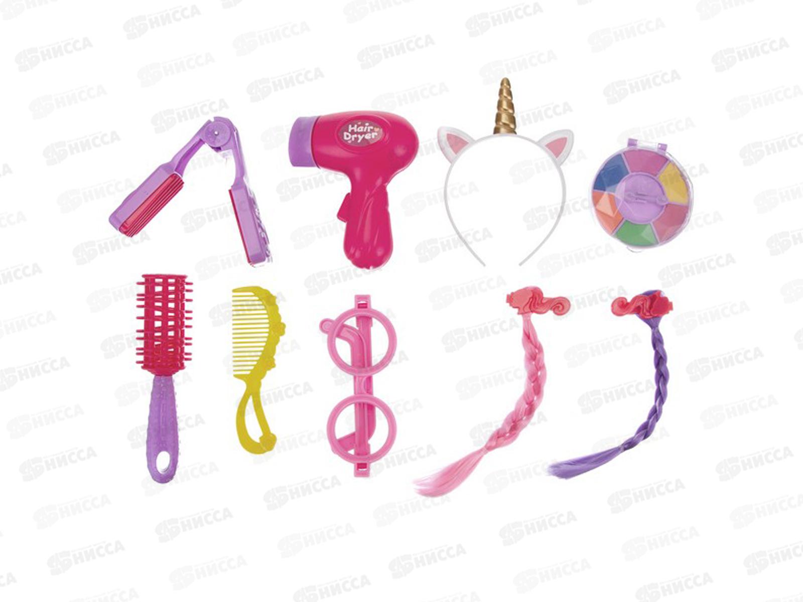 В комплекте с куклой множество аксессуаров: накладные косы с заколками, щетка и расческа, утюжок для волос, фен, туфельки, набор косметики (имитация) ободок-единорожка, очки. Все аксессуары удобно хранить в реалистичном трюмо(наклейки в комплекте), у которого подсвечивается зеркало, а игра сопровождается звуковыми эффектами. Зеркало настоящее (необходимо снять пленку).