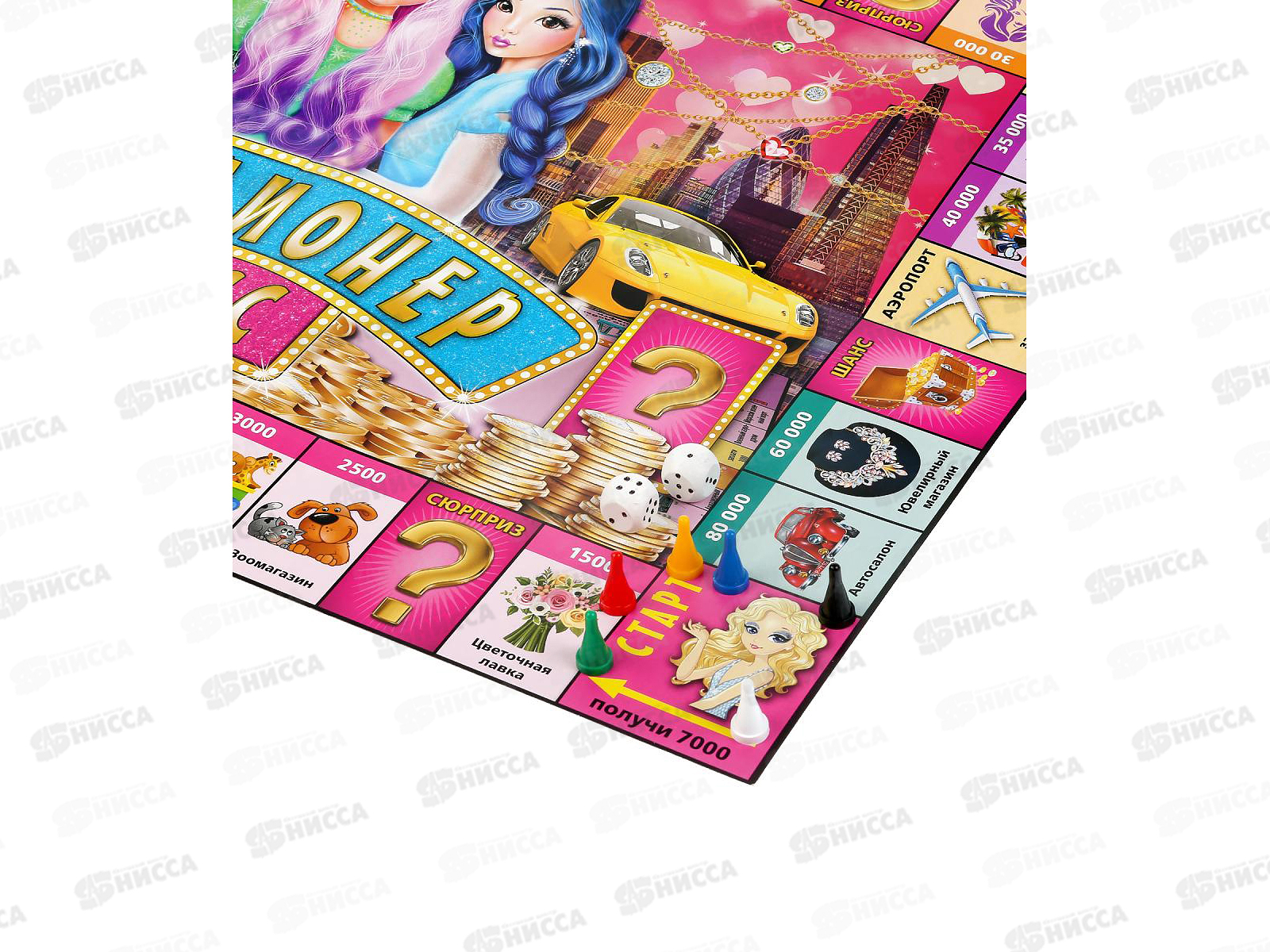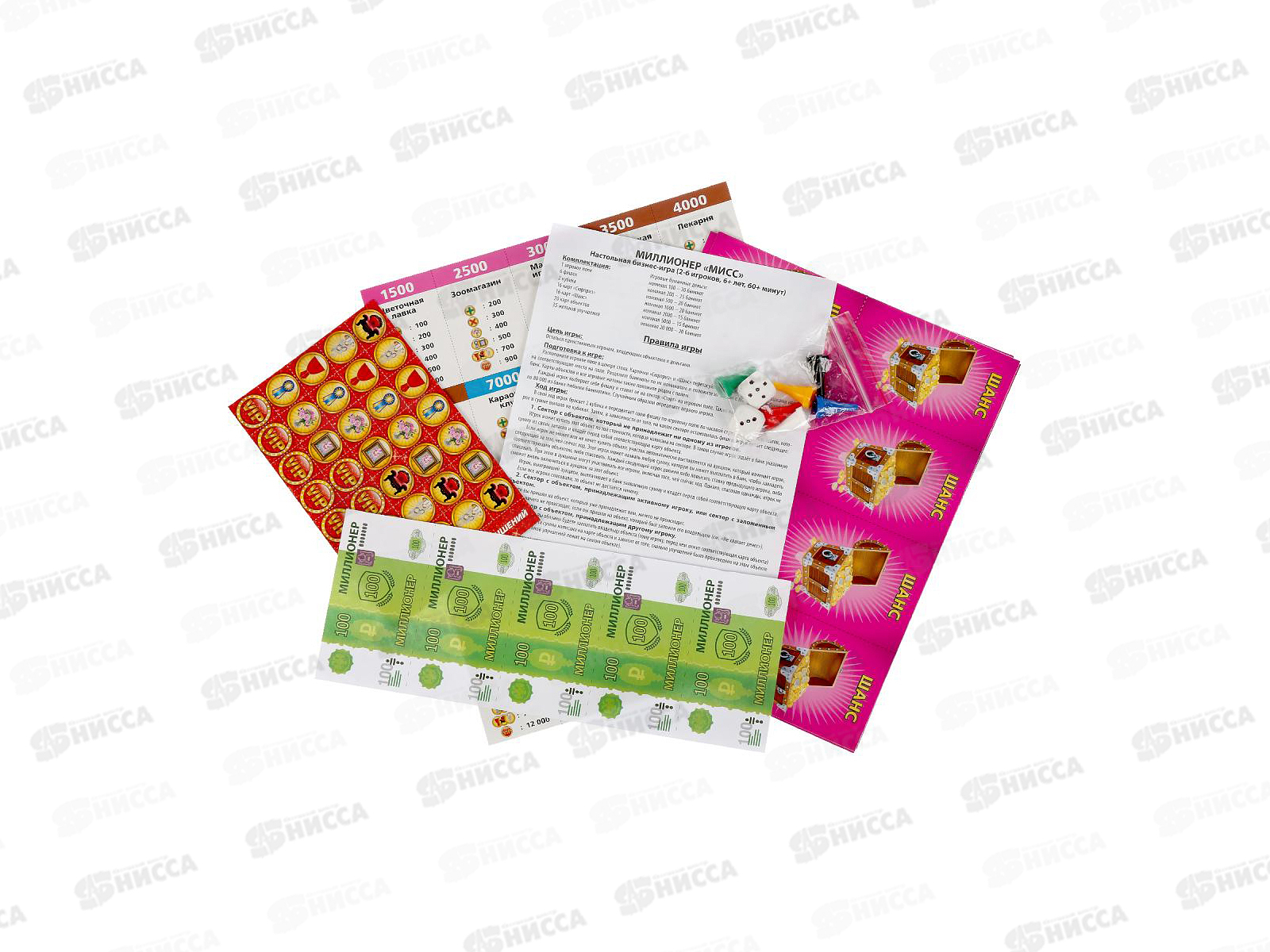 Комплектация: игровое поле, 6 фишек, 2 кубика, игровые деньги, карточки