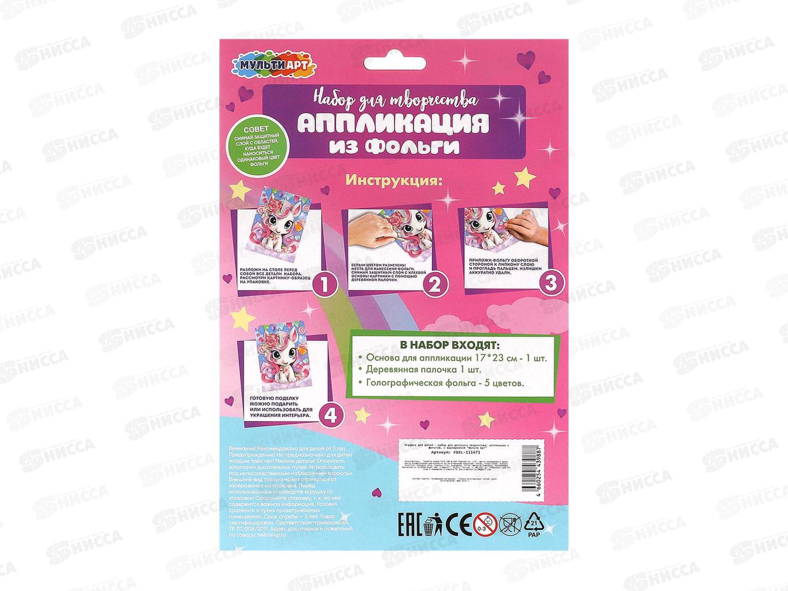 Аппликация из фольги 17*23см Единорог, FOIL-111471 Мульти Арт