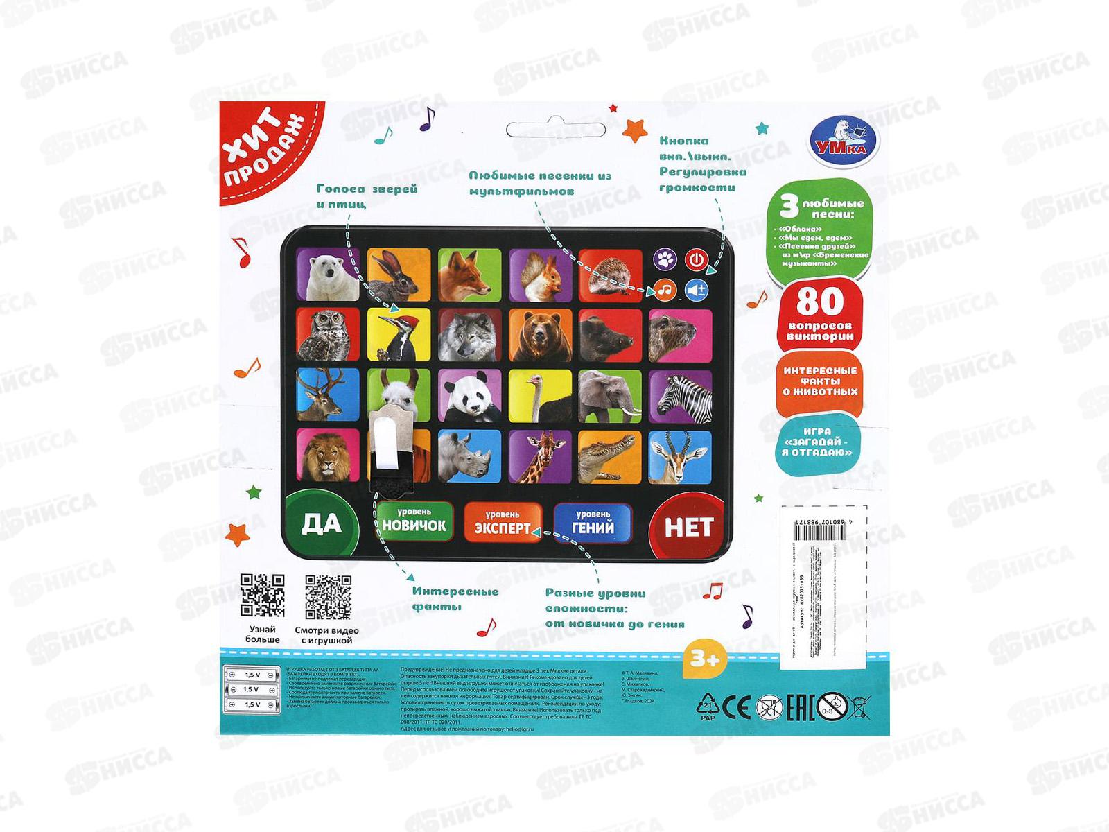 Обучающий планшет «Всё о мире животных» ТМ «УМка» станет прекрасным подарком для маленьких любознаек: 3 песенки из м/ф (фрагменты): «Облака», «Мы едем, едем», «Песенка друзей» из м/ф «Бременские музыканты», голоса зверей и птиц, 80 вопросов и ответов, интересные факты о животных, игра «Загадай и отгадай», разные уровни сложности: новичок, эксперт, гений, кнопка «Вкл./Выкл.» и регулировка громкости