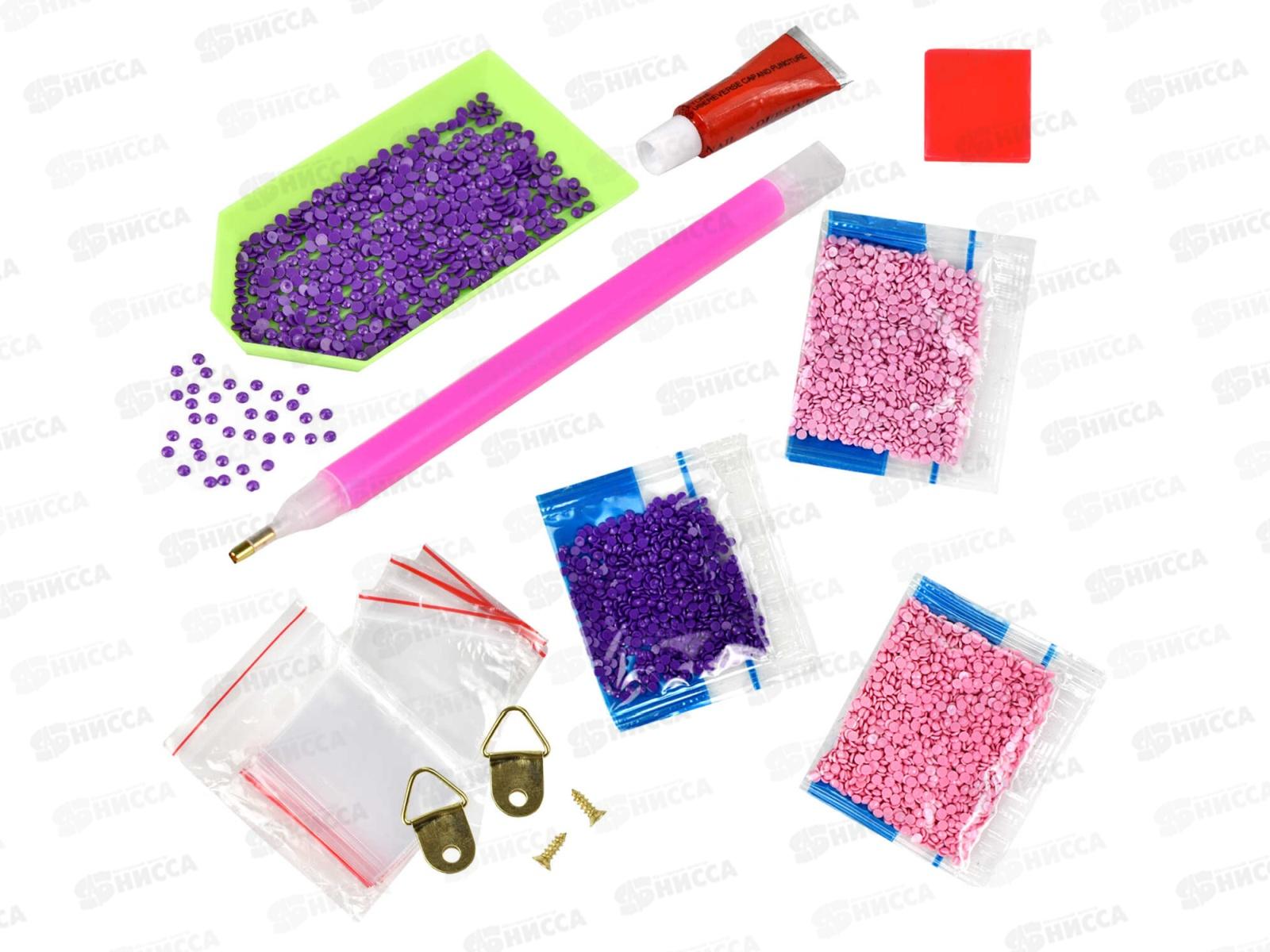 Состав набора: 24 цвета страз, холст на подрамнике с напечатанной картиной, покрытый клеевым слоем и защитной пленкой, пакеты со стразами, лоток для страз, стилус, силикон для страз, клей, подвесы для подрамника, схема, дополнительные пакеты с zip-молнией.